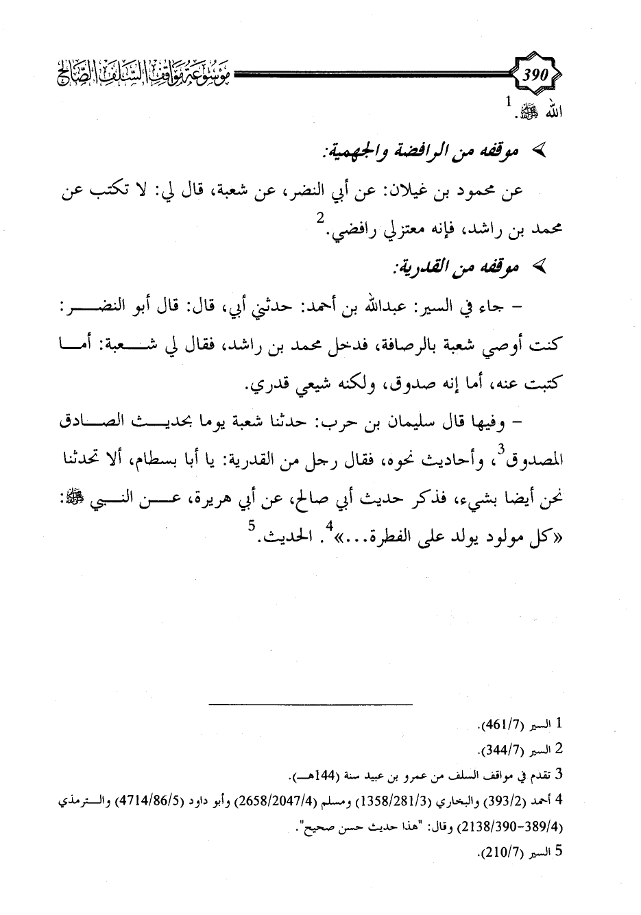 - وفيها قال سليمان بن حرب: حدثنا شعبة يوما بحديث الصادق المصدوق (¬3)، وأحاديث نحوه، فقال رجل من القدرية: يا أبا بسطام، ألا تحدثنا نحن أيضا بشيء، فذكر حديث أبي صالح، عن أبي هريرة، عن النبي - صلى الله عليه وسلم -: "كل مولود يولد على الفطرة ... " (¬4). الحديث. (¬5)