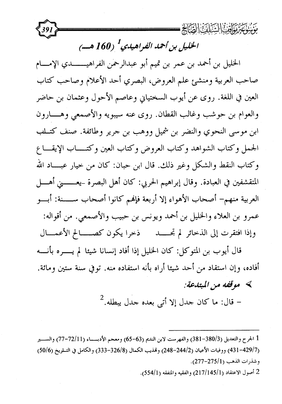 الخليل بن أحمد بن عمر بن تميم أبو عبد الرحمن الفَرَاهِيدِي الإمام صاحب العربية ومنشئ علم العروض، البصري أحد الأعلام وصاحب كتاب العين في اللغة. روى عن أيوب السختياني وعاصم الأحول وعثمان بن حاضر والعوام بن حوشب وغالب القطان. روى عنه سيبويه والأصمعي وهارون ابن موسى النحوي والنضر بن شميل ووهب بن جرير وطائفة. صنف كتاب الجمل وكتاب الشواهد وكتاب العروض وكتاب العين وكتاب الإيقاع وكتاب النقط والشكل وغير ذلك. قال ابن حبان: كان من خيار عباد الله المتقشفين في العبادة. وقال إبراهيم الحربي: كان أهل البصرة -يعني أهل العربية منهم- أصحاب الأهواء إلا أربعة فإنهم كانوا أصحاب سنة: أبو عمرو بن العلاء والخليل بن أحمد ويونس بن حبيب والأصمعي. من أقواله: