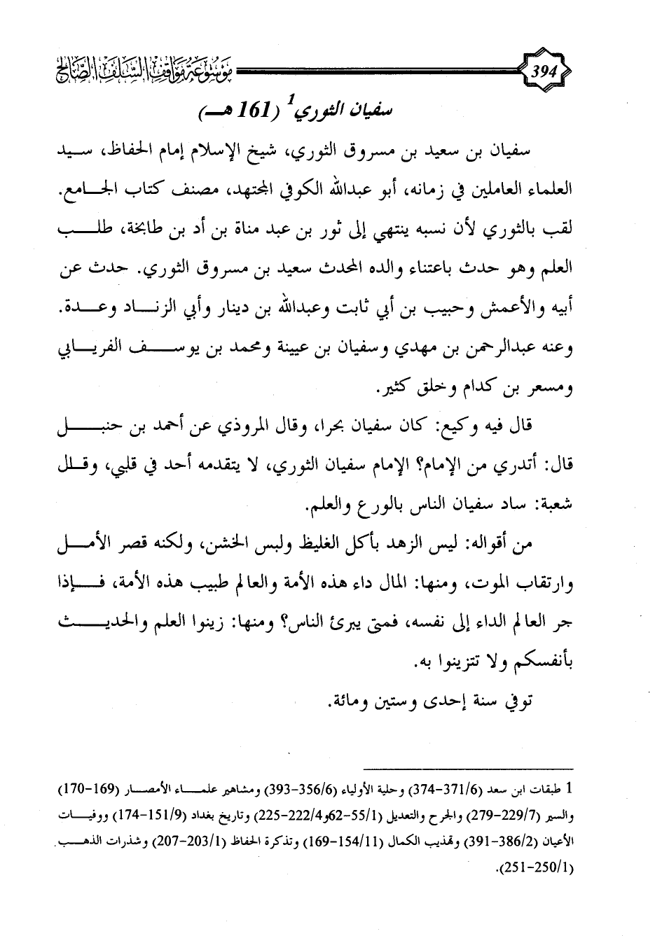 سفيان بن سعيد بن مسروق الثوري، شيخ الإسلام إمام الحفاظ، سيد العلماء العاملين في زمانه، أبو عبد الله الكوفي المجتهد، مصنف كتاب الجامع. لقب بالثوري لأن نسبه ينتهي إلى ثور بن عبد مناة بن أد بن طابخة، طلب العلم وهو حدث باعتناء والده المحدث سعيد بن مسروق الثوري. حدث عن أبيه والأعمش وحبيب بن أبي ثابت وعبد الله بن دينار وأبي الزناد وعدة. وعنه عبد الرحمن بن مهدي وسفيان بن عيينة ومحمد بن يوسف الفريابي ومسعر بن كدام وخلق كثير.