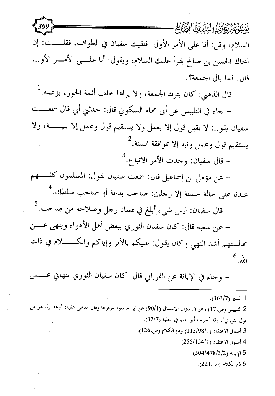 - عن شعبة قال: كان سفيان الثوري يبغض أهل الأهواء وينهى عن مجالستهم أشد النهي وكان يقول: عليكم بالأثر وإياكم والكلام في ذات الله. (¬6)