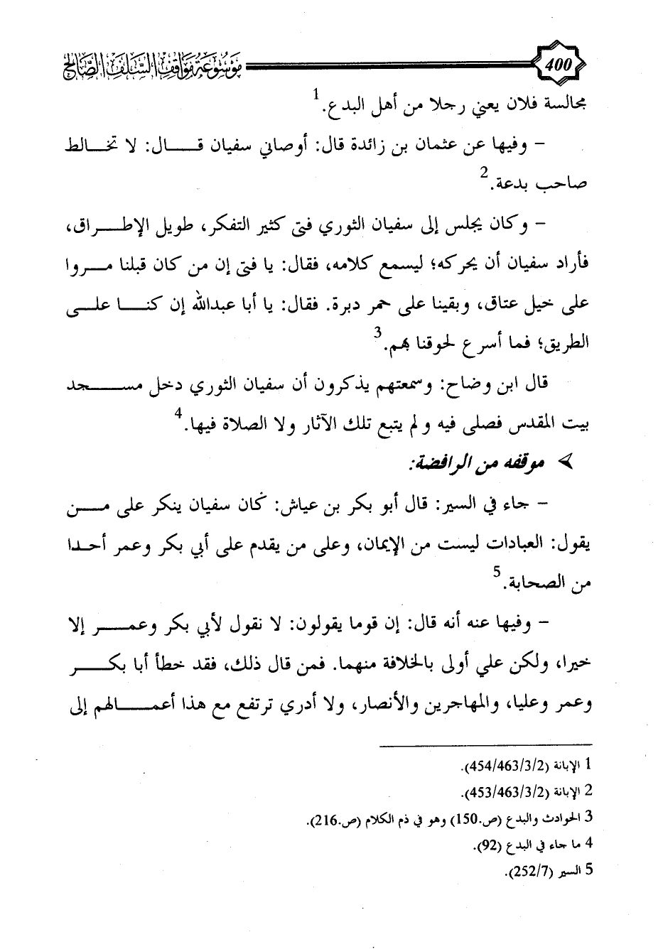 - جاء في السير: قال أبو بكر بن عياش: كان سفيان ينكر على من يقول: العبادات ليست من الإيمان، وعلى من يقدم على أبي بكر وعمر أحدا من الصحابة. (¬5)