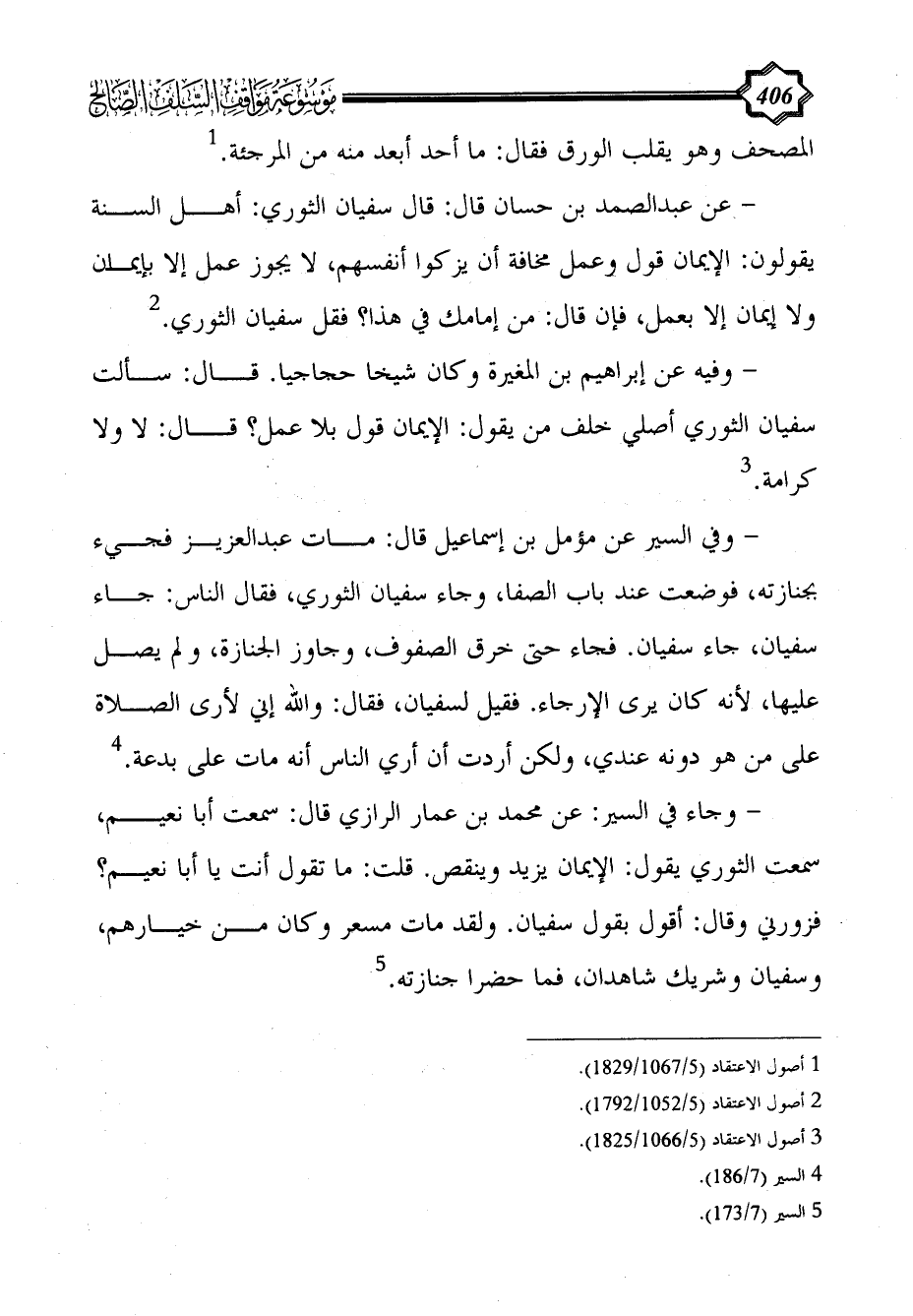 - عن عبد الصمد بن حسان قال: قال سفيان الثوري: أهل السنة يقولون: الإيمان قول وعمل مخافة أن يزكوا أنفسهم، لا يجوز عمل إلا بإيمان ولا إيمان إلا بعمل، فإن قال: من إمامك في هذا؟ فقل سفيان الثوري. (¬2)