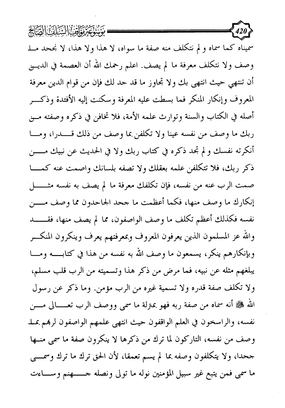 سميناه كما سماه ولم نتكلف منه صفة ما سواه، لا هذا ولا هذا، لا نجحد ما وصف ولا نتكلف معرفة ما لم يصف. اعلم رحمك الله أن العصمة في الدين أن تنتهي حيث انتهى بك ولا تجاوز ما قد حد لك فإن من قوام الدين معرفة المعروف وإنكار المنكر فما بسطت عليه المعرفة وسكنت إليه الأفئدة وذكر أصله في الكتاب والسنة وتوارث علمه الأمة، فلا تخافن في ذكره وصفته من ربك ما وصف من نفسه عينا ولا تكلفن بما وصف من ذلك قدرا، وما أنكرته نفسك ولم تجد ذكره في كتاب ربك ولا في الحديث عن نبيك من ذكر ربك، فلا تتكلفن علمه بعقلك ولا تصفه بلسانك واصمت عنه كما صمت الرب عنه من نفسه، فإن تكلفك معرفة ما لم يصف به نفسه مثل إنكارك ما وصف منها، فكما أعظمت ما جحد الجاحدون مما وصف من نفسه فكذلك أعظم تكلف ما وصف الواصفون، مما لم يصف منها، فقد والله عز المسلمون الذين يعرفون المعروف وبمعرفتهم يعرف وينكرون المنكر وبإنكارهم ينكر، يسمعون ما وصف الله به نفسه من هذا في كتابه وما يبلغهم مثله عن نبيه، فما مرض من ذكر هذا وتسميته من الرب قلب مسلم، ولا تكلف صفة قدره ولا تسمية غيره من الرب مؤمن. وما ذكر عن رسول الله - صلى الله عليه وسلم - أنه سماه من صفة ربه فهو بمنزلة ما سمى ووصف الرب تعالى من نفسه، والراسخون في العلم الواقفون حيث انتهى علمهم الواصفون لربهم بما وصف من نفسه، التاركون لما ترك من ذكرها لا ينكرون صفة ما سمى منها جحدا، ولا يتكلفون وصفه بما لم يسم تعمقا، لأن الحق ترك ما ترك وسمى ما سمى فمن يتبع غير سبيل المؤمنين نوله ما تولى ونصله جهنم وساءت