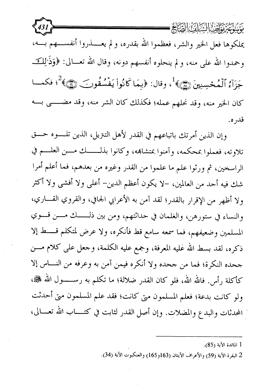 وإن الذين أمرتك باتباعهم في القدر لأهل التنزيل، الذين تلوه حق تلاوته، فعملوا بمحكمه، وآمنوا بمتشابهه، وكانوا بذلك من العلم في الراسخين، ثم ورثوا علم ما علموا من القدر وغيره من بعدهم، فما أعلم أمرا شك فيه أحد من العالمين، -لا يكون أعظم الدين- أعلى ولا أفشى ولا أكثر ولا أظهر من الإقرار بالقدر؛ لقد آمن به الأعرابي الجافي، والقروي القاري، والنساء في ستورهن، والغلمان في حداثتهم، ومن بين ذلك من قوي المسلمين وضعيفهم، فما سمعه سامع قط فأنكره، ولا عرض لمتكلم قط إلا ذكره، لقد بسط الله عليه المعرفة، وجمع عليه الكلمة، وجعل على كلام من جحده النكرة؛ فما من جحده ولا أنكره فيمن آمن به وعرفه من الناس إلا كأكلة رأس. فالله الله، فلو كان القدر ضلالة؛ ما تكلم به رسول الله - صلى الله عليه وسلم -، ولو كانت بدعة؛ فعلم المسلمون متى كانت؛ فقد علم المسلمون متى أحدثت المحدثات والبدع والمضلات. وإن أصل القدر لثابت في كتاب الله تعالى،