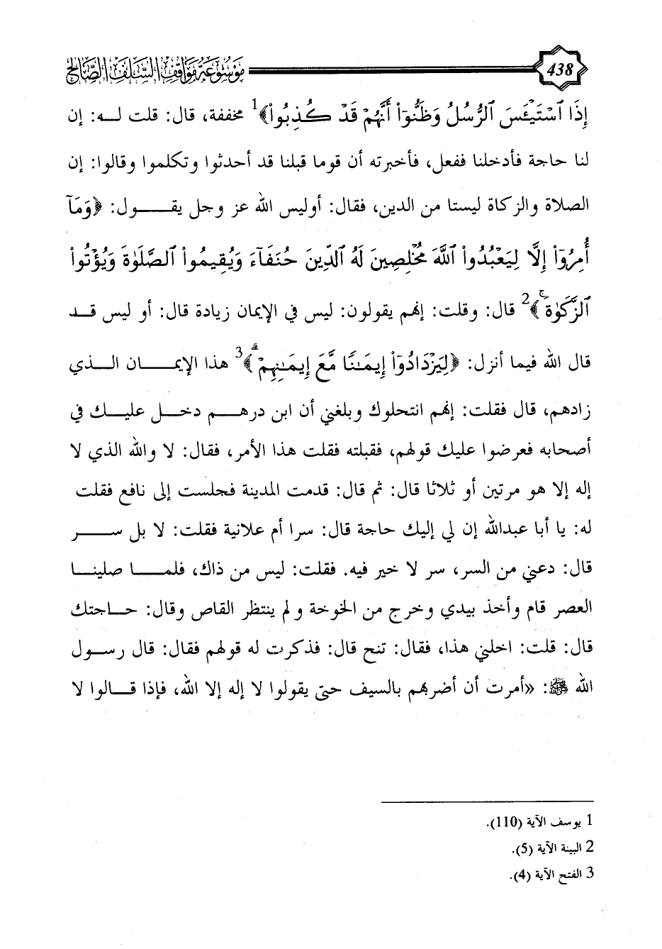 فقلت: ليس من ذاك، فلما صلينا العصر قام وأخذ بيدي وخرج من الخوخة ولم ينتظر القاص وقال: حاجتك قال: قلت: اخلني هذا، فقال: تنح قال: فذكرت له قولهم فقال: قال رسول الله - صلى الله عليه وسلم -: "أمرت أن أضربهم بالسيف حتى يقولوا لا إله إلا الله، فإذا قالوا لا