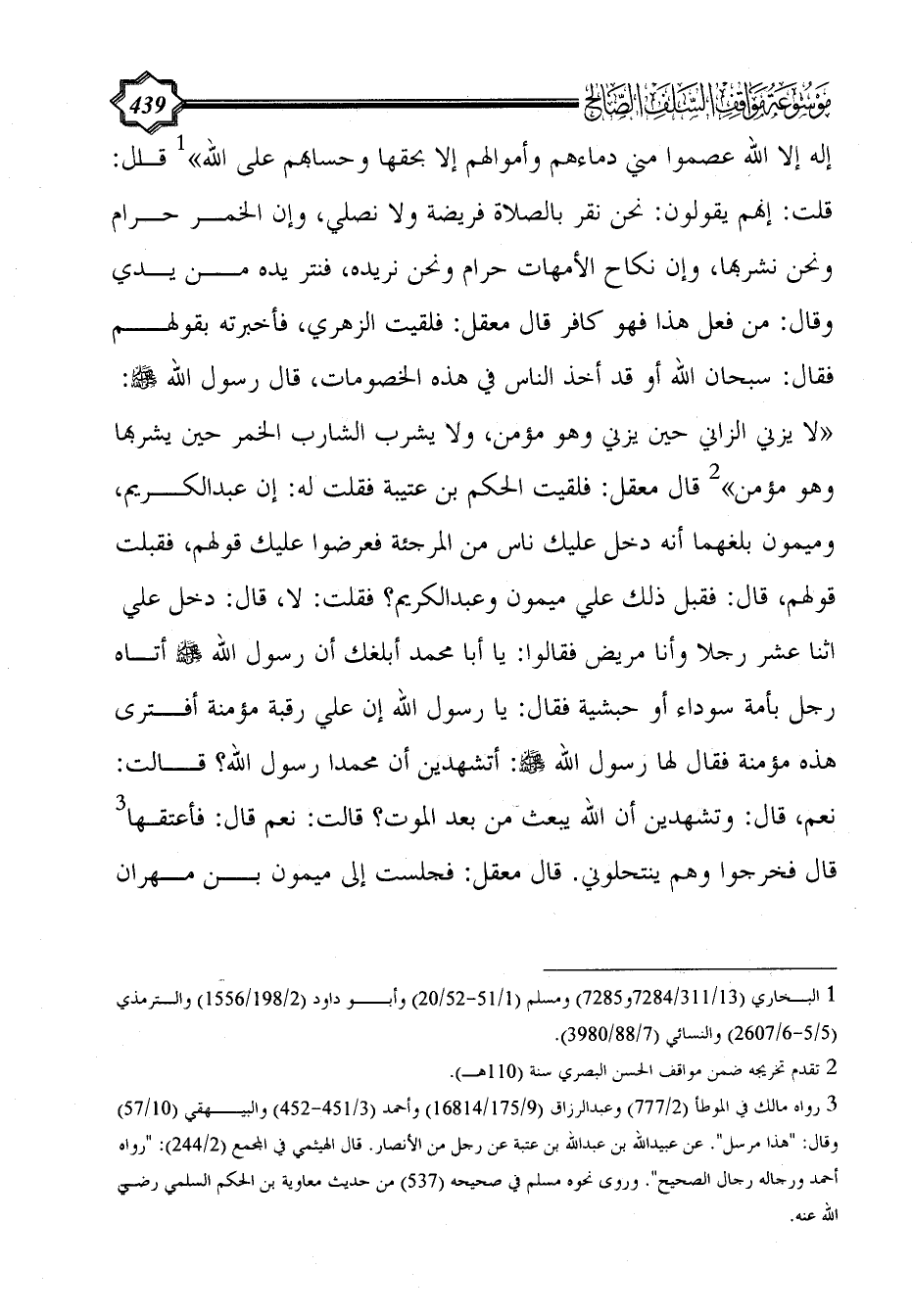 إله إلا الله عصموا مني دماءهم وأموالهم إلا بحقها وحسابهم على الله" (¬1) قال: قلت: إنهم يقولون: نحن نقر بالصلاة فريضة ولا نصلي، وإن الخمر حرام ونحن نشربها، وإن نكاح الأمهات حرام ونحن نريده، فنتر يده من يدي وقال: من فعل هذا فهو كافر قال معقل: فلقيت الزهري، فأخبرته بقولهم فقال: سبحان الله أو قد أخذ الناس في هذه الخصومات، قال رسول الله - صلى الله عليه وسلم -: "لا يزني الزاني حين يزني وهو مؤمن، ولا يشرب الشارب الخمر حين يشربها وهو مؤمن" (¬2) قال معقل: فلقيت الحكم بن عتيبة فقلت له: إن عبد الكريم، وميمون بلغهما أنه دخل عليك ناس من المرجئة فعرضوا عليك قولهم، فقبلت قولهم، قال: فَقَبِلَ ذَلِكَ عَلَيَّ ميمون وعبد الكريم؟ فقلت: لا، قال: دخل علي اثنا عشر رجلا وأنا مريض فقالوا: يا أبا محمد أبلغك أن رسول الله - صلى الله عليه وسلم - أتاه رجل بأمة سوداء أو حبشية فقال: يا رسول الله إن علي رقبة مؤمنة أفترى هذه مؤمنة فقال لها رسول الله - صلى الله عليه وسلم -: أتشهدين أن محمدا رسول الله؟ قالت: نعم، قال: وتشهدين أن الله يبعث من بعد الموت؟ قالت: نعم قال: فأعتقها (¬3)