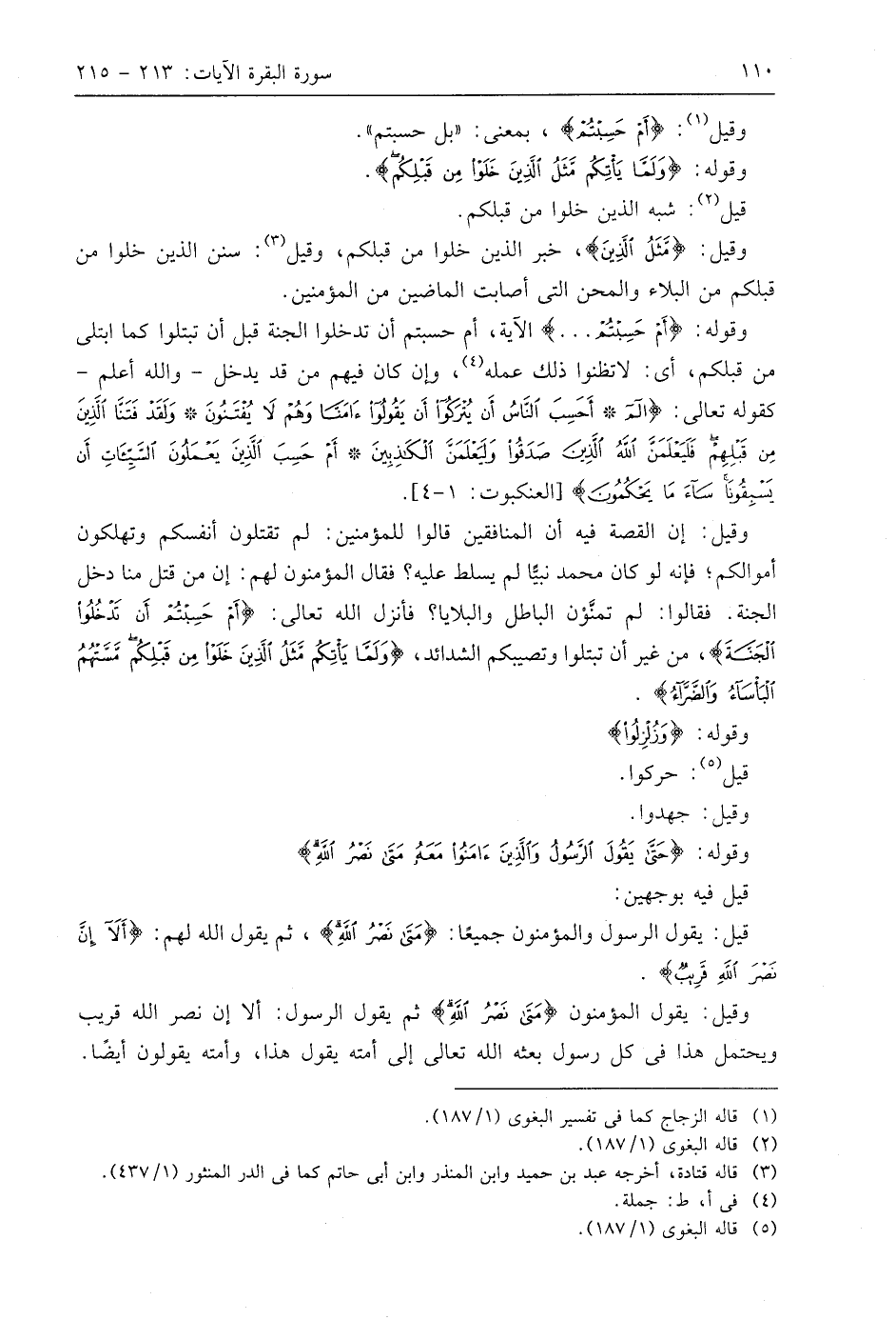 وقوله: (أَمْ حَسِبْتُمْ. . .) الآية، أم حسبتم أن تدخلوا الجنة قبل أن تبتلوا كما ابتلي من قبلكم، أي: لا تظنوا ذلك عمله، وإن كان فيهم من قد يدخل - واللَّه أعلم - كقوله تعالى: (الم (1) أَحَسِبَ النَّاسُ أَنْ يُتْرَكُوا أَنْ يَقُولُوا آمَنَّا وَهُمْ لَا يُفْتَنُونَ (2) وَلَقَدْ فَتَنَّا الَّذِينَ مِنْ قَبْلِهِمْ فَلَيَعْلَمَنَّ اللَّهُ الَّذِينَ صَدَقُوا وَلَيَعْلَمَنَّ الْكَاذِبِينَ (3) أَمْ حَسِبَ الَّذِينَ يَعْمَلُونَ السَّيِّئَاتِ أَنْ يَسْبِقُونَا سَاءَ مَا يَحْكُمُونَ (4).