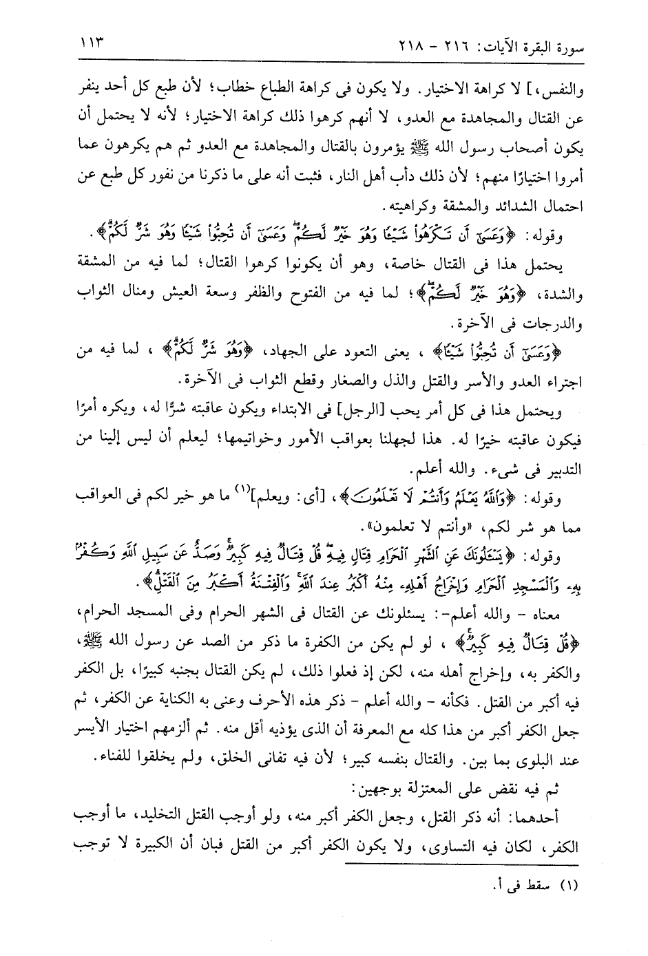 معناه - واللَّه أعلم -: يسئلونك عن القتال في الشهر الحرام وفي المسجد الحرام، (قُل قِتَالٌ فِيهِ كَبِيرٌ)، لو لم يكن من الكفرة ما ذكر من الصد عن رسول اللَّه - صَلَّى اللَّهُ عَلَيهِ وَسَلَّمَ -، والكفر به، وإخراج أهله منه، لكن إذ فعلوا ذلك، لم يكن القتال بجنبه كبيرًا، بل الكفر فيه أكبر من القتل. فكأنه - واللَّه أعلم - ذكر هذه الأحرف وعنى به الكناية عن الكفر، ثم جعل الكفر أكبر من هذا كله مع المعرفة أن الذي يؤذيه أقل منه. ثم ألزمهم اختيار الأيسر عند البلوى بما بين. والقتال بنفسه كبير؛ لأن فيه تفاني الخلق، ولم يخلقوا للفناء.
