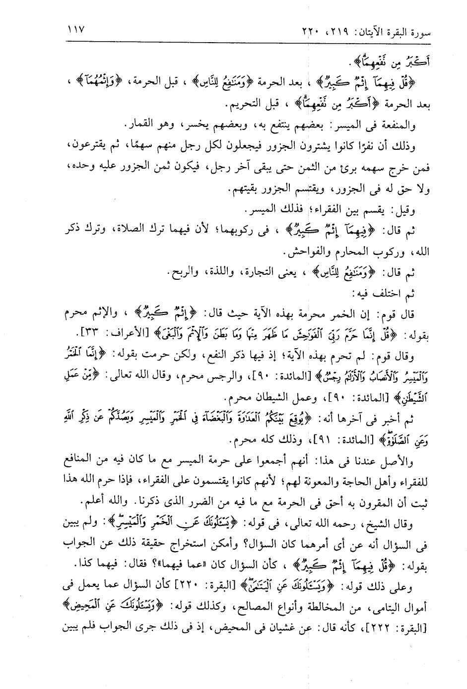 (قُلْ فِيهِمَا إِثْمٌ كَبِيرٌ)، بعد الحرمة (وَمَنَافِعُ لِلنَّاسِ)، قبل الحرمة، (وَإِثْمُهُمَا)، بعد الحرمة (أَكْبَرُ مِنْ نَفْعِهِمَا)، قبل التحريم.