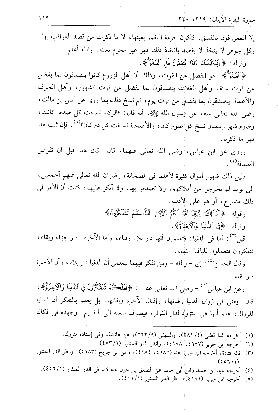 وعن ابن عَبَّاسٍ - رضي اللَّه تعالى عنه -: (لَعَلَّكُمْ تَتَفَكَّرُونَ فِي الدُّنْيَا وَالْآخِرَةِ)، قال: يعني في زوال الدنيا وفنائها، وإقبال الآخرة وبقائها. بل يعلم بالتفكر أن الدنيا للزوال، علم أنها هي للتزود لدار القرار، فيصرف سعيه إلى التقديم، وجهده في فكاك