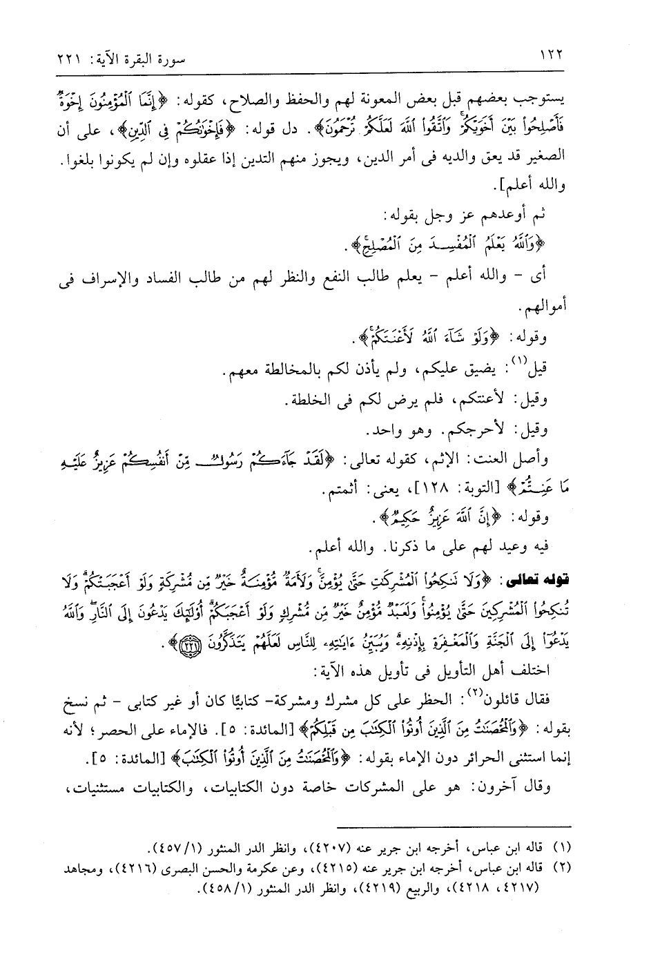 فقال قائلون: الحظر على كل مشرك ومشركة -كتابيًّا كان أو غير كتابي- ثم نسخ بقوله: (وَالْمُحْصَنَاتُ مِنَ الَّذِينَ أُوتُوا الْكِتَابَ مِنْ قَبْلِكُمْ). فالإماء على الحصر؛ لأنه إنما استثنى الحرائر دون الإماء بقوله: (وَالْمُحْصَنَاتُ مِنَ الَّذِينَ أُوتُوا الْكِتَابَ).
