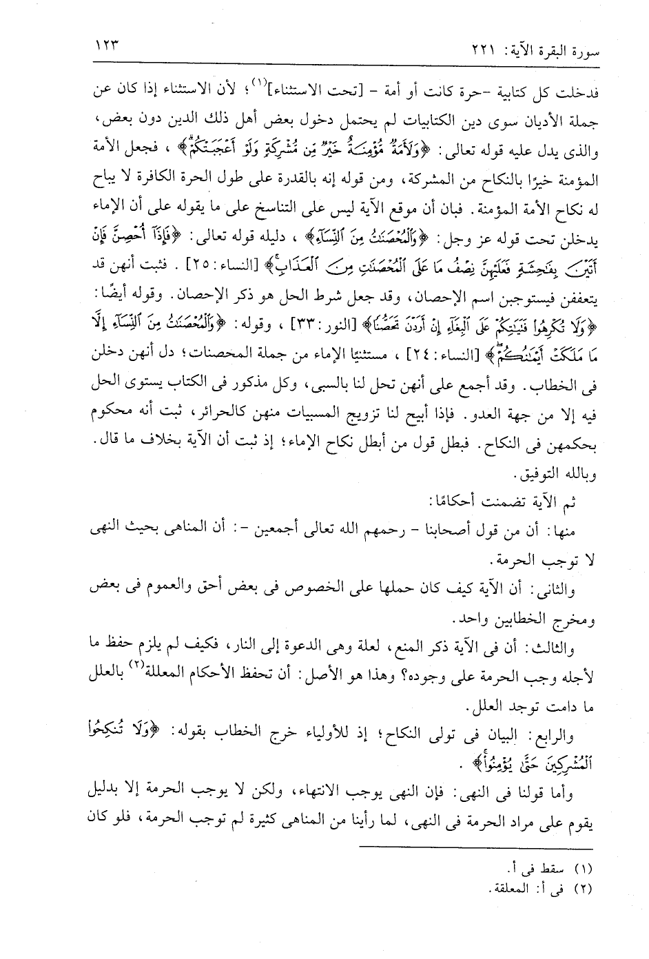 فدخلت كل كتابية -حرة كانت أو أمة- تحت الاستثناء؛ لأن الاستثناء إذا كان عن جملة الأديان سوى دين الكتابيات لم يحتمل دخول بعض أهل ذلك الدِّين دون بعض، والذي يدل عليه قوله تعالى: (وَلَأَمَةٌ مُؤْمِنَةٌ خَيْرٌ مِنْ مُشْرِكَةٍ وَلَوْ أَعْجَبَتْكُمْ)، فجعل الأمة المؤمنة خيرًا بالنكاح من المشركة، ومن قوله إنه بالقدرة على طول الحرة الكافرة لا يباح له نكاح الأمة المؤمنة. فبان أن موقع الآية ليس على التناسخ على ما يقوله على أن الإماء يدخلن تحت قوله عَزَّ وَجَلَّ: (وَالْمُحْصَنَاتُ مِنَ النِّسَاءِ)، دليله قوله تعالى: (فَإِذَا أُحْصِنَّ فَإِنْ أَتَيْنَ بِفَاحِشَةٍ فَعَلَيْهِنَّ نِصْفُ مَا عَلَى الْمُحْصَنَاتِ مِنَ الْعَذَابِ)، فثبت أنهن قد يتعففن فيستوجبن اسم الإحصان، وقد جعل شرط الحل هو ذكر الإحصان. وقوله أيضًا: (وَلَا تُكْرِهُوا فَتَيَاتِكُمْ عَلَى الْبِغَاءِ إِنْ أَرَدْنَ تَحَصُّنًا). وقوله: (وَالْمُحْصَنَاتُ مِنَ النِّسَاءِ إِلَّا مَا مَلَكَتْ أَيْمَانُكُمْ)، مستثنيًا الإماء من جملة المحصنات؛ دل أنهن دخلن في الخطاب. وقد أجمع على أنهن تحل لنا بالسبي، وكل مذكور في الكتاب يستوي الحل فيه إلا من جهة العدو. فإذا أبيح لنا تزويج المسبيات منهن كالحرائر، ثبت أنه محكوم بحكمهن في النكاح. فبطل قول من أبطل نكاح الإماء؛ إذ ثبت أن الآية بخلاف ما قال. وباللَّه التوفيق.