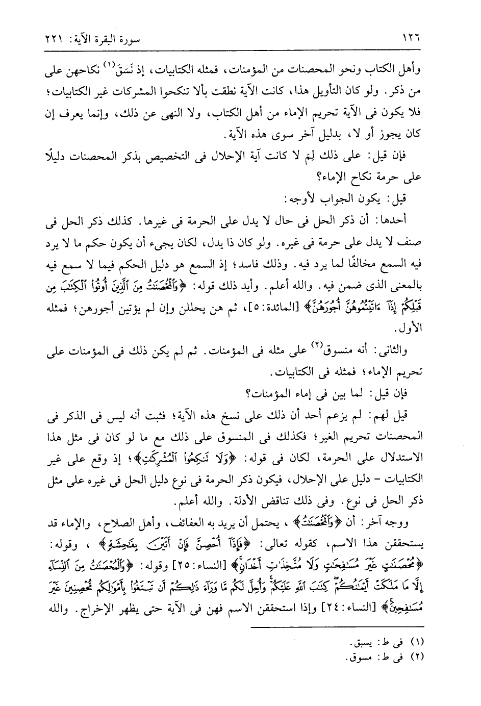 وأهل الكتاب ونحو المحصنات من المؤمنات، فمثله الكتابيات، إذ نَسَقَ نكاحهن على من ذكر. ولو كان التأويل هذا، كانت الآية نطقت بألا تنكحوا المشركات غير الكتابيات؛ فلا يكون في الآية تحريم الإماء من أهل الكتاب، ولا النهي عن ذلك، وإنما يعرف إن كان يجوز أو لا، بدليل آخر سوى هذه الآية.