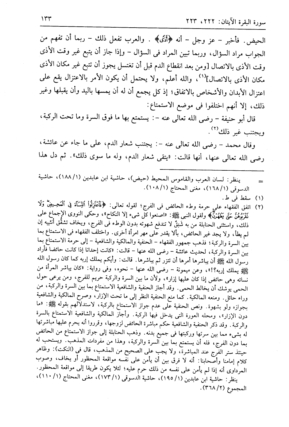 الحيض. فأخبر - عَزَّ وَجَلَّ - أنه (أَذًى). والعرب تفعل ذلك - ربما أن تفهم من الجواب مراد السؤال، وربما تبين المراد في السؤال - وإذا جاز أن يتبع غير وقت الأذى وقت الأذى بالاتصال أومن بعد انقطاع الدم قبل أن تغتسل يجوز أن تتبع غير مكان الأذى مكان الأذى بالاتصال، واللَّه أعلم، ولا يحتمل أن يكون الأمر بالاعتزال يقع على اعتزال الأبدان والأشخاص بالاتفاق؛ إذ كل يجمع أن له أن يمسها باليد وأن يقبلها وغير ذلك، إلا أنهم اختلفوا في موضع الاستمتاع: