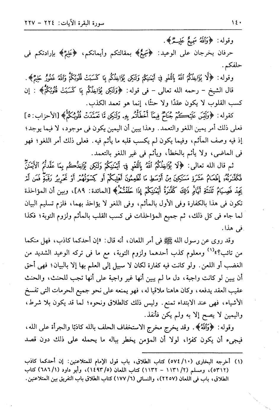 ثم قال اللَّه تعالى: (لَا يُؤَاخِذُكُمُ اللَّهُ بِاللَّغْوِ فِي أَيْمَانِكُمْ وَلَكِنْ يُؤَاخِذُكُمْ بِمَا عَقَّدْتُمُ الْأَيْمَانَ فَكَفَّارَتُهُ إِطْعَامُ عَشَرَةِ مَسَاكِينَ مِنْ أَوْسَطِ مَا تُطْعِمُونَ أَهْلِيكُمْ أَوْ كِسْوَتُهُمْ أَوْ تَحْرِيرُ رَقَبَةٍ فَمَنْ لَمْ يَجِدْ فَصِيَامُ ثَلَاثَةِ أَيَّامٍ ذَلِكَ كَفَّارَةُ أَيْمَانِكُمْ إِذَا حَلَفْتُمْ وَاحْفَظُوا أَيْمَانَكُمْ)، وبين أن المؤاخذة تكون في هذا بالكفارة وفي الأول بالمأثم، وفي اللغو لا يؤاخذ بهما، فلزم تسليم البيان لما جاء في كل ذلك، ثم جميع المؤاخذات في كسب القلب بالمأثم ولزوم التوبة؛ فكذا في هذا.