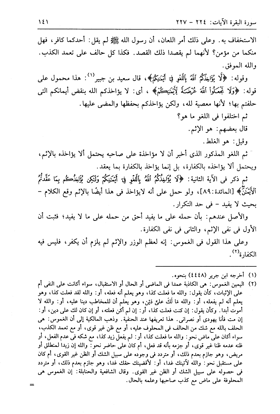 وقوله: (لَا يُؤَاخِذُكُمُ اللَّهُ بِاللَّغْوِ فِي أَيْمَانِكُمْ)، قال سعيد بن جبير: هذا محمول على قوله: (وَلَا تَجْعَلُوا اللَّهَ عُرْضَةً لِأَيْمَانِكُمْ)، أي: لا يؤاخذكم اللَّه بنقض أيمانكم التي حلفتم بها؛ لأنها معصية لله، ولكن يؤاخذكم بحفظها والمضي عليها.