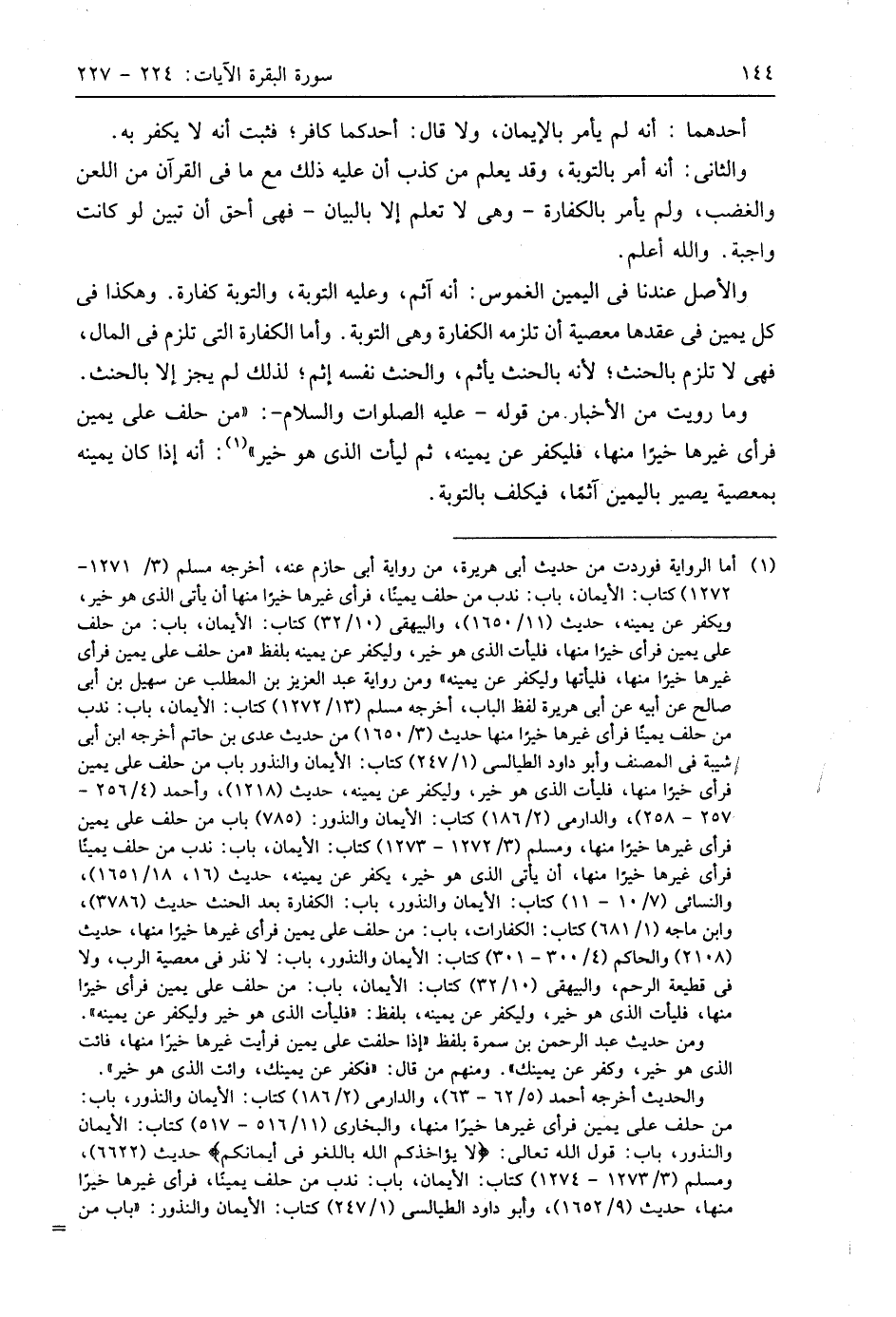 وما رويت من الأخبار - من قوله - عليه الصلوات والسلام -: " من حلف على يمين فرأى غيرها خيرًا منها، فليكفر عن يمينه، ثم ليأت الذي هو خير ": أنه إذا كان يمينه بمعصية يصير باليمين آثمًا، فيكلف بالتوبة.