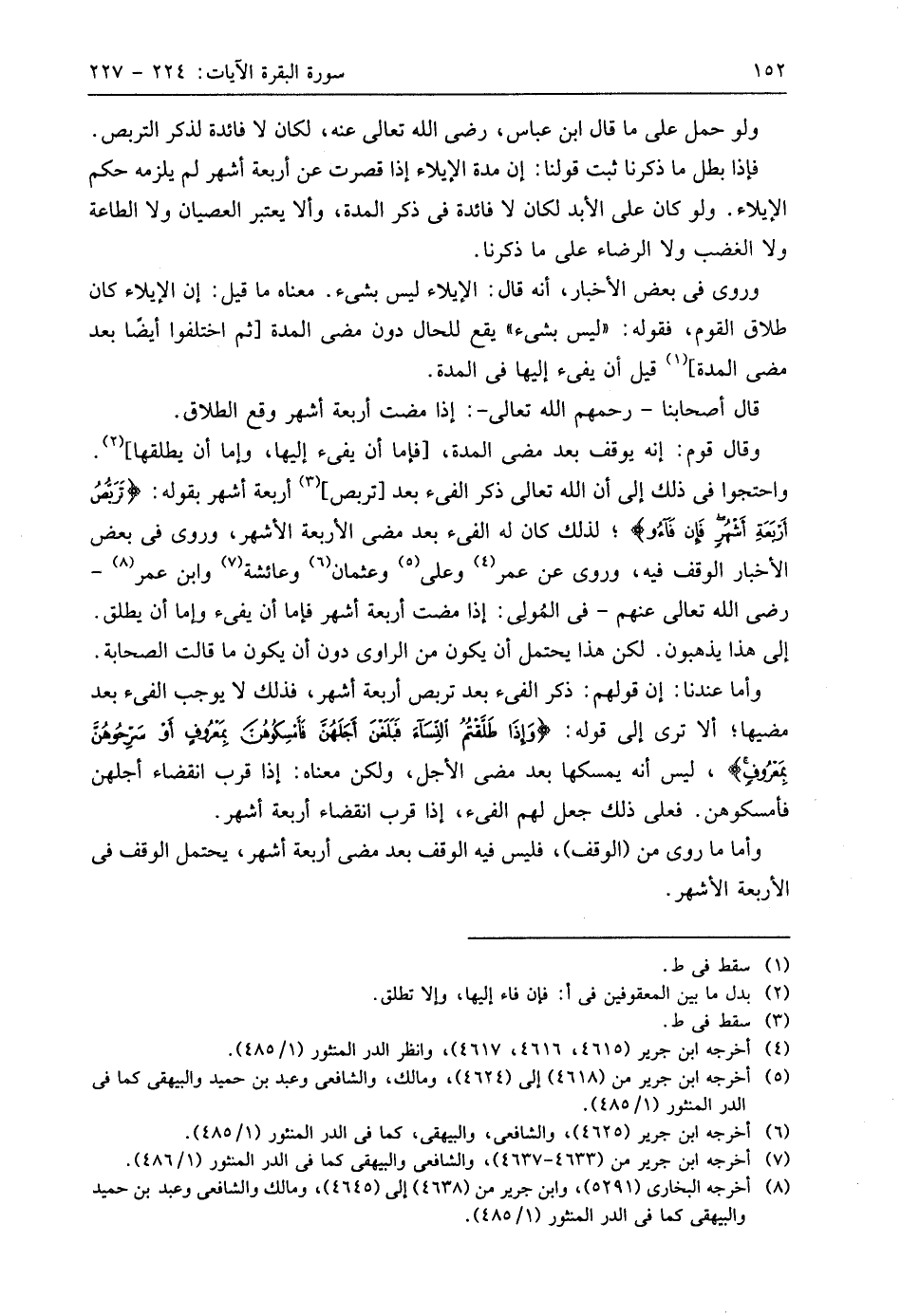 واحتجوا في ذلك إلى أن اللَّه تعالى ذكر الفيء بعد تربص أربعة أشهر بقوله: (تَرَبُّصُ أَرْبَعَةِ أَشْهُرٍ فَإِنْ فَاءُوا)؛ لذلك كان له الفيء بعد مضي الأربعة الأشهر، وروى في بعض الأخبار الوقف فيه، ورُويَ عن عمر وعلي وعثمان وعائشة وابن عمر - رضيَ اللَّهُ تعالى عنهم - في الْمُولي: إذا مضت أربعة أشهر فإما أن يفيء وإما أن يطلق. إلى هذا يذهبون. لكن هذا يحتمل أن يكون من الراوي دون أن يكون ما قالت الصحابة. وأما عندنا: إن قولهم: ذكر الفيء بعد تربص أربعة أشهر، فذلك لا يوجب الفيء بعد مضيها؛ ألا ترى إلى قوله: (وَإِذَا طَلَّقْتُمُ النِّسَاءَ فَبَلَغْنَ أَجَلَهُنَّ فَأَمْسِكُوهُنَّ بِمَعْرُوفٍ أَوْ سَرِّحُوهُنَّ بِمَعْرُوفٍ)، ليس أنه يمسكها بعد مضي الأجل، ولكن معناه: إذا قرب انقضاء أجلهن فأمسكوهن. فعلى ذلك جعل لهم الفيء، إذا قرب انقضاء أربعة أشهر.
