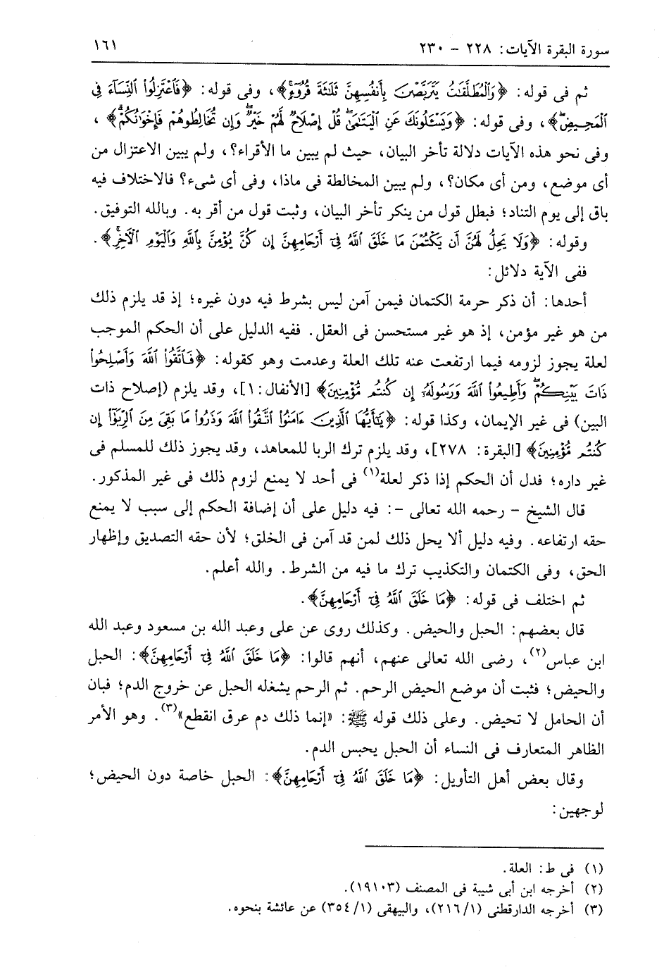 وقوله: (وَلَا يَحِلُّ لَهُنَّ أَنْ يَكْتُمْنَ مَا خَلَقَ اللَّهُ فِي أَرْحَامِهِنَّ إِنْ كُنَّ يُؤْمِنَّ بِاللَّهِ وَالْيَوْمِ الْآخِرِ).