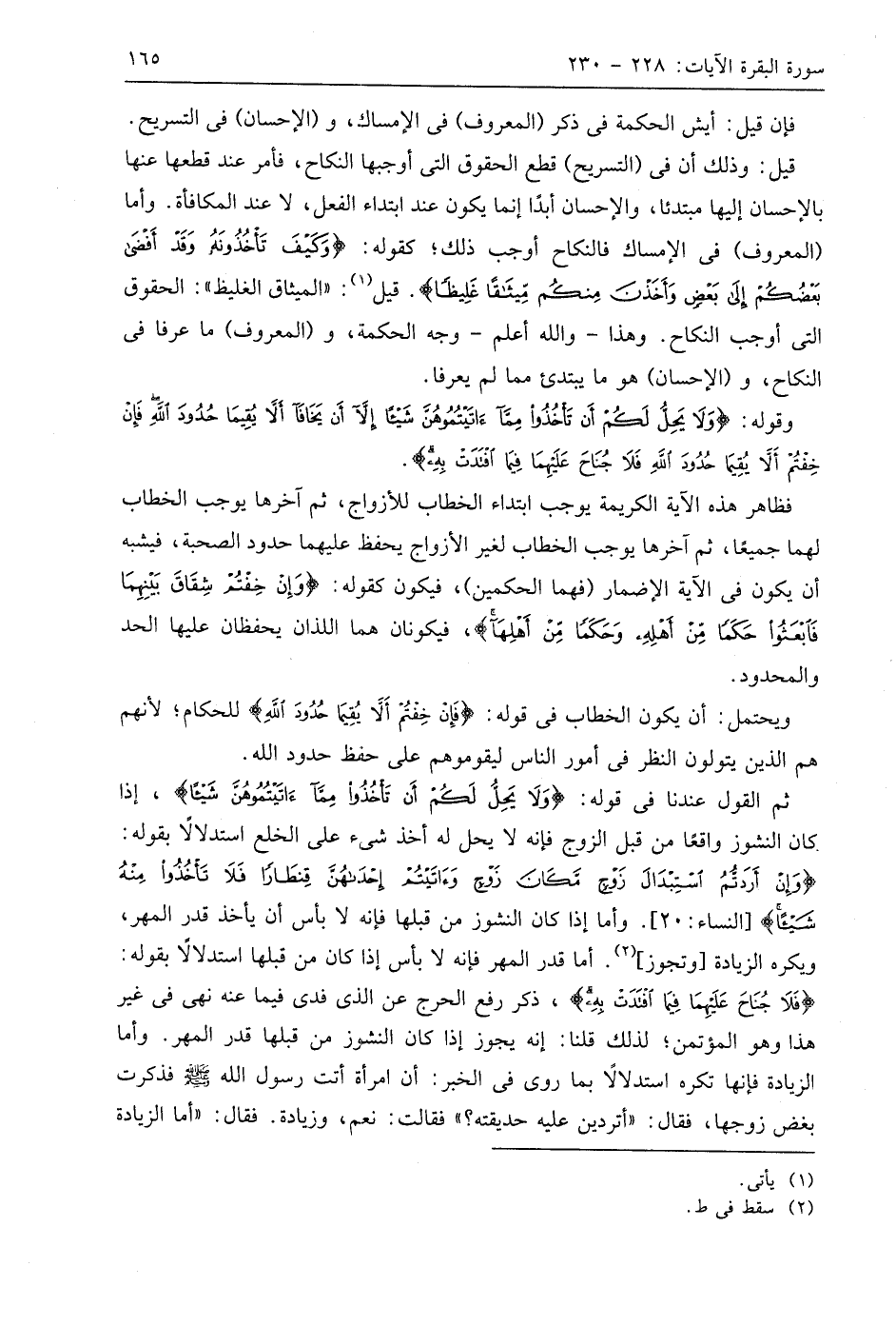 فظاهر هذه الآية الكريمة يوجب ابتداء الخطاب للأزواج، ثم آخرها يوجب الخطاب لهما جميعًا، ثم آخرها يوجب الخطاب لغير الأزواج يحفظ. عليهما حدود الصحبة، فيشبه أن يكون في الآية الإضمار (فهما الحكمين)، فيكون كقوله: (وَإِنْ خِفْتُمْ شِقَاقَ بَيْنِهِمَا فَابْعَثُوا حَكَمًا مِنْ أَهْلِهِ وَحَكَمًا مِنْ أَهْلِهَا)، فيكونان هما اللذان يحفظان عليها الحد والمحدود.