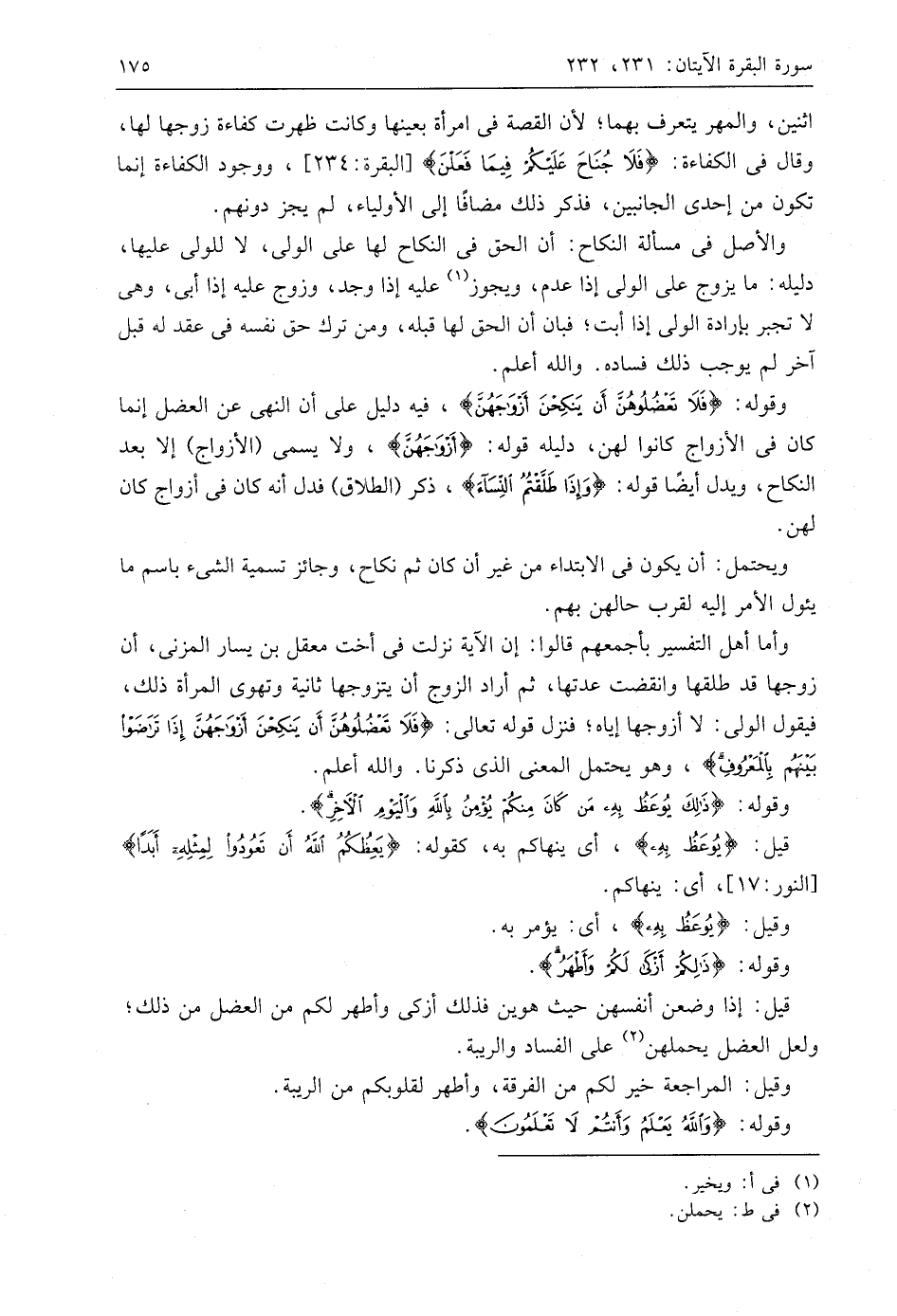 وأما أهل التفسير بأجمعهم قالوا: إن الآية نزلت في أخت معقل بن يسار المزني، أن زوجها قد طلقها وانقضت عدتها، ثم أراد الزوج أن يتزوجها ثانية وتهوى المرأة ذلك، فيقول الولي: لا أزوجها إياه؛ فنزل قوله تعالى: (فَلَا تَعْضُلُوهُنَّ أَنْ يَنْكِحْنَ أَزْوَاجَهُنَّ إِذَا تَرَاضَوْا بَيْنَهُمْ بِالْمَعْرُوفِ)، وهو يحتمل المعنى الذي ذكرنا. واللَّه أعلم.