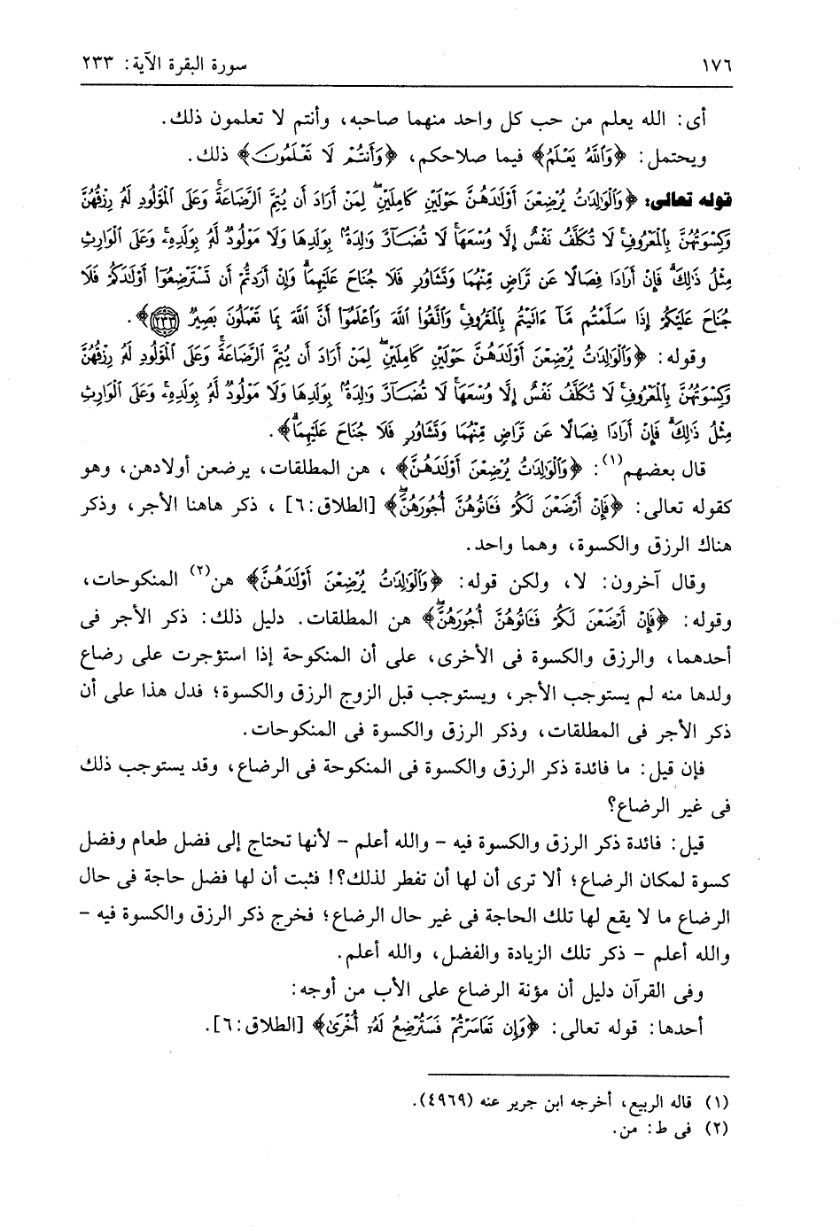 قوله تعالى: (وَالْوَالِدَاتُ يُرْضِعْنَ أَوْلَادَهُنَّ حَوْلَيْنِ كَامِلَيْنِ لِمَنْ أَرَادَ أَنْ يُتِمَّ الرَّضَاعَةَ وَعَلَى الْمَوْلُودِ لَهُ رِزْقُهُنَّ وَكِسْوَتُهُنَّ بِالْمَعْرُوفِ لَا تُكَلَّفُ نَفْسٌ إِلَّا وُسْعَهَا لَا تُضَارَّ وَالِدَةٌ بِوَلَدِهَا وَلَا مَوْلُودٌ لَهُ بِوَلَدِهِ وَعَلَى الْوَارِثِ مِثْلُ ذَلِكَ فَإِنْ أَرَادَا فِصَالًا عَنْ تَرَاضٍ مِنْهُمَا وَتَشَاوُرٍ فَلَا جُنَاحَ عَلَيْهِمَا وَإِنْ أَرَدْتُمْ أَنْ تَسْتَرْضِعُوا أَوْلَادَكُمْ فَلَا جُنَاحَ عَلَيْكُمْ إِذَا سَلَّمْتُمْ مَا آتَيْتُمْ بِالْمَعْرُوفِ وَاتَّقُوا اللَّهَ وَاعْلَمُوا أَنَّ اللَّهَ بِمَا تَعْمَلُونَ بَصِيرٌ (233)