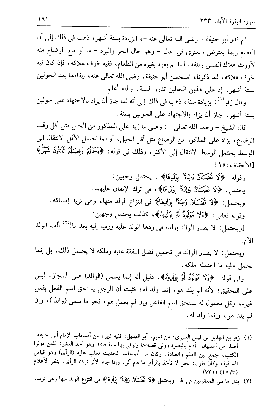 وقال زفر: بزيادة سنة، ذهب في ذلك إلى أنه لما جاز أن يزاد بالاجتهاد على حولين بستة أشهر، جاز أن يزاد بالاجتهاد على الحولين بسنة.