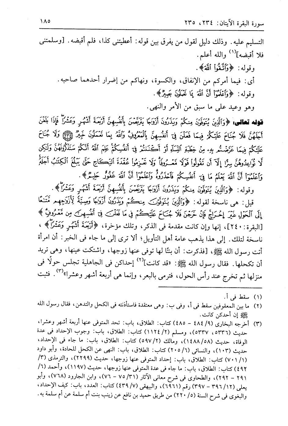 قوله تعالى: (وَالَّذِينَ يُتَوَفَّوْنَ مِنْكُمْ وَيَذَرُونَ أَزْوَاجًا يَتَرَبَّصْنَ بِأَنْفُسِهِنَّ أَرْبَعَةَ أَشْهُرٍ وَعَشْرًا فَإِذَا بَلَغْنَ أَجَلَهُنَّ فَلَا جُنَاحَ عَلَيْكُمْ فِيمَا فَعَلْنَ فِي أَنْفُسِهِنَّ بِالْمَعْرُوفِ وَاللَّهُ بِمَا تَعْمَلُونَ خَبِيرٌ (234) وَلَا جُنَاحَ عَلَيْكُمْ فِيمَا عَرَّضْتُمْ بِهِ مِنْ خِطْبَةِ النِّسَاءِ أَوْ أَكْنَنْتُمْ فِي أَنْفُسِكُمْ عَلِمَ اللَّهُ أَنَّكُمْ سَتَذْكُرُونَهُنَّ وَلَكِنْ لَا تُوَاعِدُوهُنَّ سِرًّا إِلَّا أَنْ تَقُولُوا قَوْلًا مَعْرُوفًا وَلَا تَعْزِمُوا عُقْدَةَ النِّكَاحِ حَتَّى يَبْلُغَ الْكِتَابُ أَجَلَهُ وَاعْلَمُوا أَنَّ اللَّهَ يَعْلَمُ مَا فِي أَنْفُسِكُمْ فَاحْذَرُوهُ وَاعْلَمُوا أَنَّ اللَّهَ غَفُورٌ حَلِيمٌ (235)