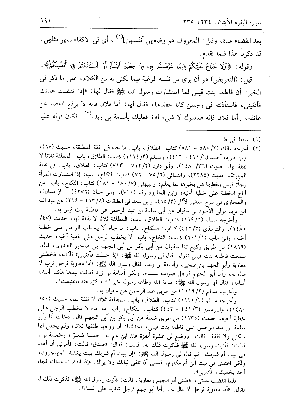 وقوله: (وَلَا جُنَاحَ عَلَيْكُمْ فِيمَا عَرَّضْتُمْ بِهِ مِنْ خِطْبَةِ النِّسَاءِ أَوْ أَكْنَنْتُمْ فِي أَنْفُسِكُمْ (235) قيل: (التعريض) هو أن يرى من نفسه الرغبة فيما يكنى به من الكلام، على ما ذكر في الخبر: أن فاطمة بنت قيس لما استشارت رسول اللَّه - صَلَّى اللَّهُ عَلَيهِ وَسَلَّمَ - فقال لها: " إذا انقضت عدتك فآذنيني، فاستأذنته في رجلين كانا خطباها، فقال لها: أما فلان فإنه لا يرفع العصا عن عاتقه، وأما فلان فإنه صعلوك لا شيء له؛ فعليك بأسامة بن زيد ". فكان قوله عليه