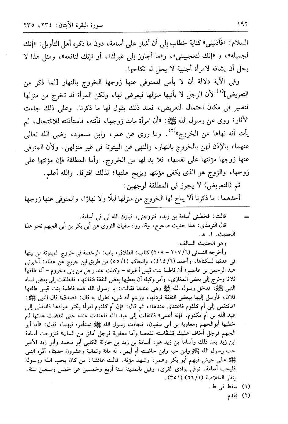 وفي الآية دلالة أن لا بأس للمتوفى عنها زوجها الخروج بالنهار لما ذكر من التعريض، لأن الرجل لا يأتيها منزلها فيعرض لها، ولكن المرأة قد تخرج من منزلها فتصير في مكان احتمال التعريض، فعند ذلك يقول لها ما ذكرنا. وعلى ذلك جاءت الآثار؛ رُويَ عن رسول اللَّه - صَلَّى اللَّهُ عَلَيهِ وَسَلَّمَ -: " أن امرأة مات زوجها، فأتته، فاستأذنته للاكتحال، لم يأت أنه نهاها عن الخروج ". وما رُويَ عن عمر، وابن مسعود، رضيَ اللَّهُ تعالى عنهما، بالإذن لهن بالخروج بالنهار، والنهي عن البيتوتة في غير منزلهن. ولأن المتوفى عنها زوجها مؤنتها على نفسها، فلا بد لها من الخروج. وأما المطلقة فإن مؤنتها على زوجها، والزوج هو الذي يكفي مؤنتها ويزيح علتها؛ لذلك افترقا. واللَّه أعلم.