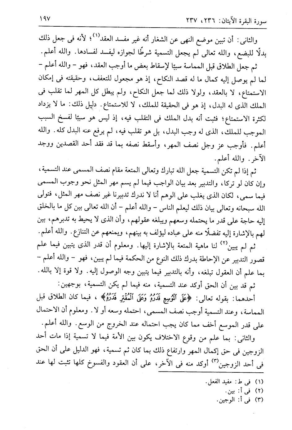 ثم إذا لم تكن التسمية جعل اللَّه تبارك وتعالى المتعة مقام نصف المسمى عند التسمية، وإن كان لو تركا، والتدبير بعد بيان الواجب فيما لم يسم مهر المثل نحو وجوب المسمى فيما سمى، لكان الذي يغلب على الوهم أنا لا ندرك تدبيرنا غير نصف مهر المثل، فتولى اللَّه سبحانه وتعالى بيان ذلك ليعلم الناس - واللَّه أعلم - أن اللَّه تعالى بين كل ما بالخلق إليه حاجة على قدر ما يحتمله وسعهم ويبلغه عقولهم، وأن الذي لا يحيط به تدبرهم، بين لهم بالإشارة إليه تفضلًا منه على عباده ليؤلف به بينهم، ويمنعهم عن التنازع. واللَّه أعلم.