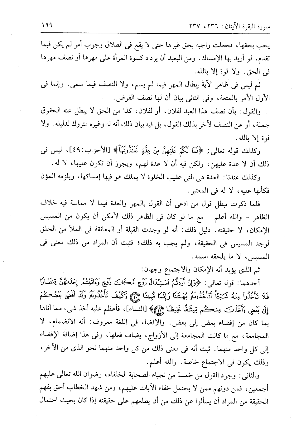 يجب بحقها، فجعلت واجبه بحق غيرها حتى لا يقع في الطلاق وجوب أمر لم يكن فيما تقدم، لو أريد بها الإمساك. ومن البعيد أن يزداد كسوة المرأة على مهرها أو نصف مهرها في الحق. ولا قوة إلا باللَّه.