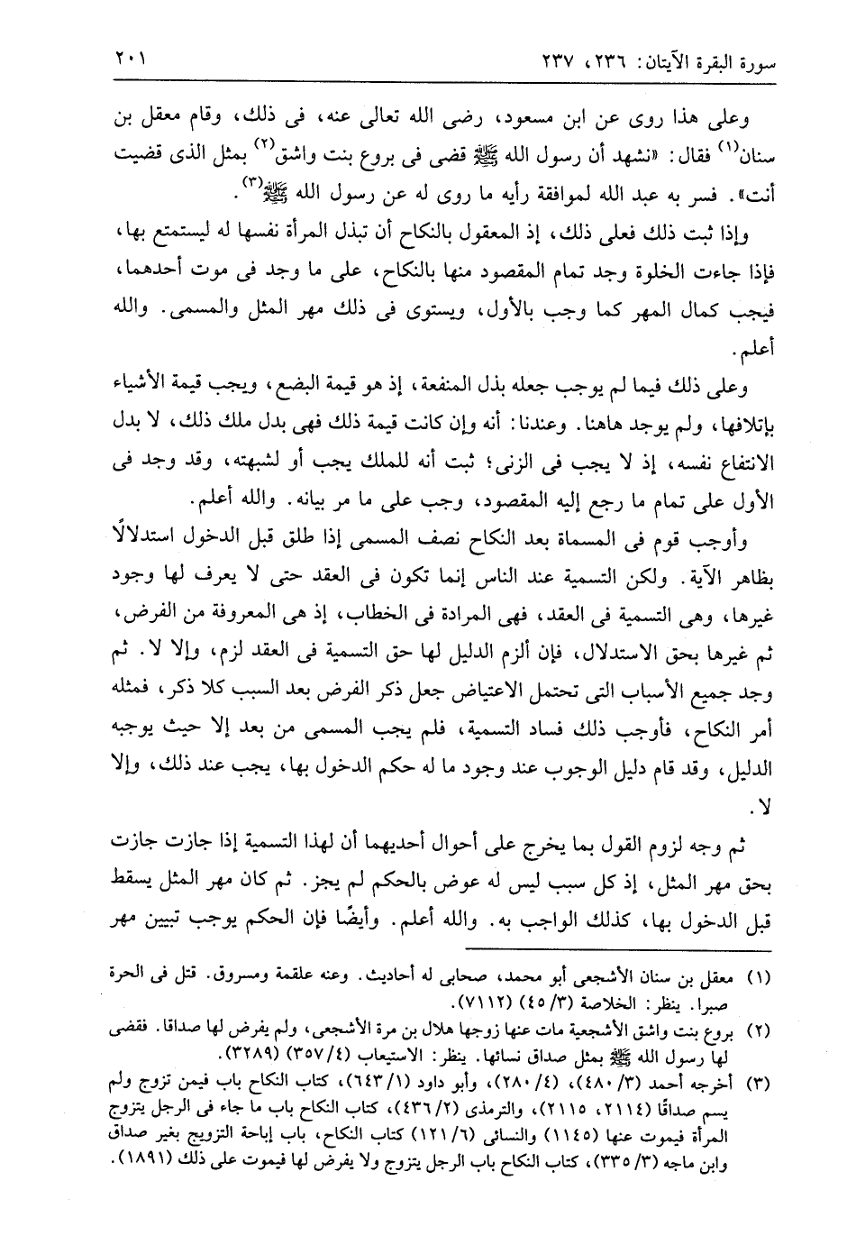وعلى هذا رُويَ عن ابن مسعود، رضيَ اللَّهُ تعالى عنه، في ذلك، وقام معقل بن سنان فقال: " نشهد أن رسول اللَّه - صَلَّى اللَّهُ عَلَيهِ وَسَلَّمَ - قضى في بروع بنت واشق بمثل الذي قضيت أنت ". فسر به عبد اللَّه لموافقة رأيه ما روي له عن رسول اللَّه - صَلَّى اللَّهُ عَلَيهِ وَسَلَّمَ -.