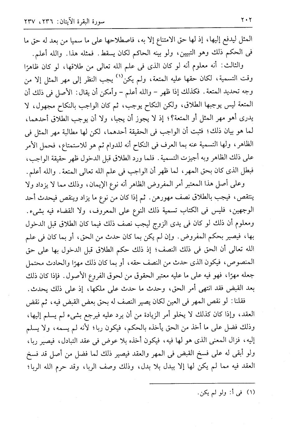 وعلى أصل هذا المعتبر أمر المفروض الظاهر أنه نوع الإيمان، وذلك مما لا يزداد ولا ينتقص، فيجب بالطلاق نصف مهورهن. ثم إذا كان من نوع ما يزاد وينقص فيحدث أحد الوجهين، فليس في الكتاب تسمية ذلك النوع على المعروف، ولا القضاء فيه بشيء.