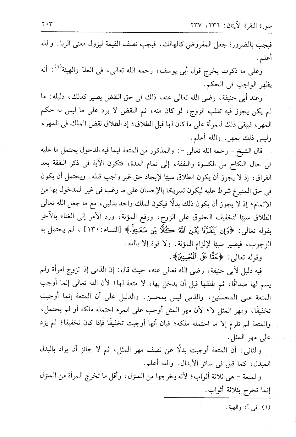 قال الشيخ - رحمه اللَّه تعالى -: والمذكور من المتعة فيما فيه الدخول يحتمل ما عليه في حال النكاح من الكسوة والنفقة، إلى تمام العدة، فتكون الآية في ذكر النفقة بعد الفراق؛ إذ لا يجوز أن يكون الطلاق سببًا لإيجاد حق غير واجب قبله. ويحتمل أن يكون في حق المتبرع شرط عليه ليكون تسريحًا بالإحسان على ما رغب في غير المدخول بها من الإتمام؛ إذ لا يجوز أن يكون ذلك بدلًا فيكون لملك واحد بدلين، مع ما جعل اللَّه تعالى الطلاق سببا لتخفيف الحقوق على الزوج، ورفع المؤنة، ورد الأمر إلى الغناء بالآخر بقوله تعالى: (وَإِنْ يَتَفَرَّقَا يُغْنِ اللَّهُ كُلًّا مِنْ سَعَتِهِ)، لم يحتمل به الوجوب، فيصير سببًا لإلزام المؤنة. ولا قوة إلا باللَّه.