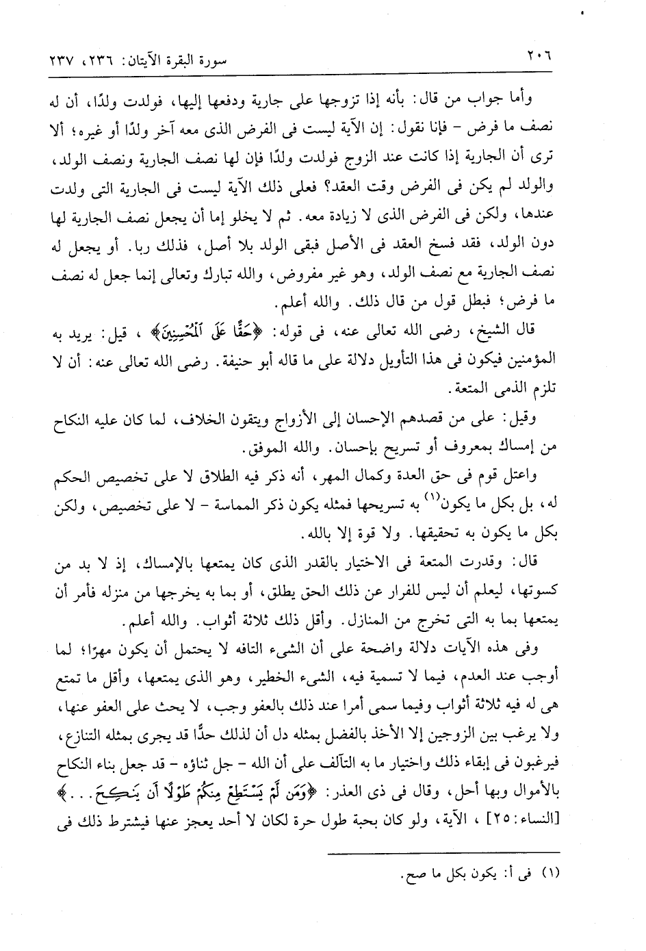 قال الشيخ، رضيَ اللَّهُ تعالى عنه، في قوله: (حَقًّا عَلَى الْمُحْسِنِينَ)، قيل: يريد به المؤمنين فيكون في هذا التأويل دلالة على ما قاله أبو حنيفة. رضيَ اللَّهُ تعالى عنه: أن لا تلزم الذمي المتعة.