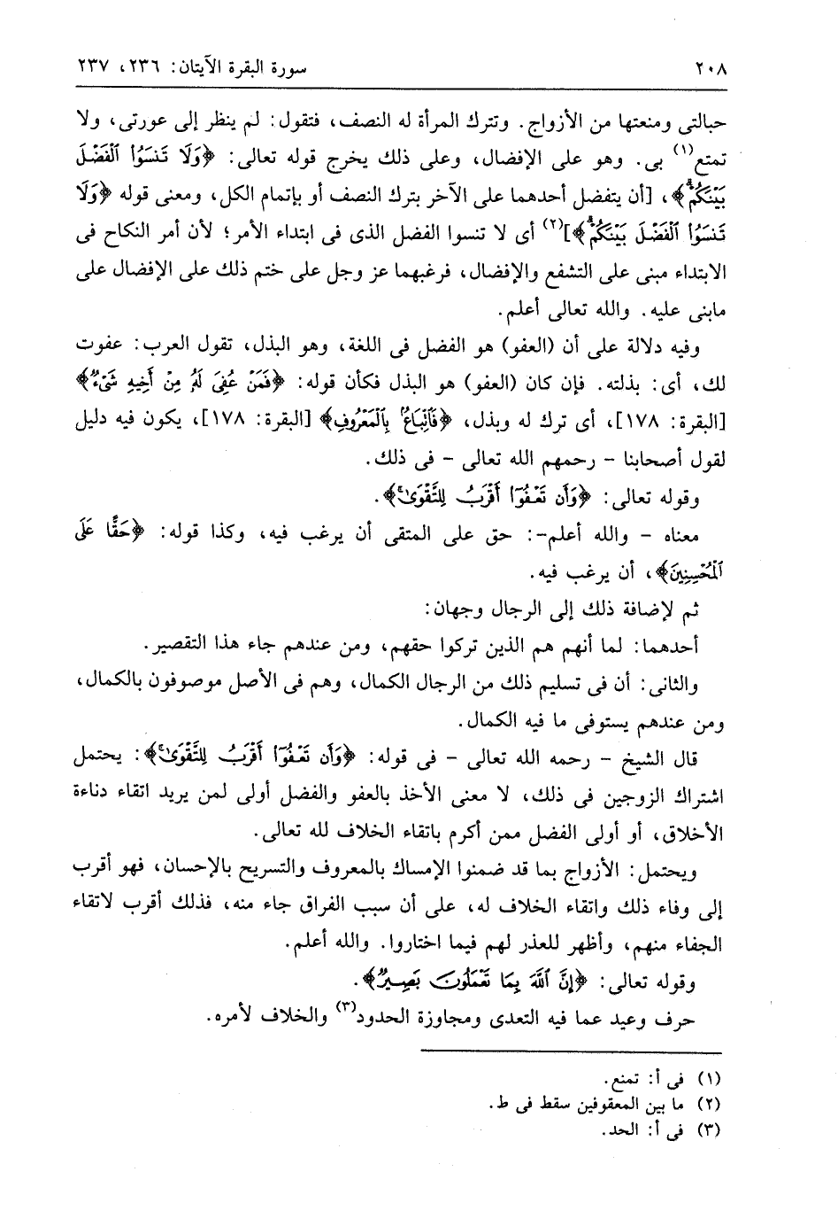 قال الشيخ - رحمه اللَّه تعالى - في قوله: (وَأَنْ تَعْفُوا أَقْرَبُ لِلتَّقْوَى): يحتمل اشتراك الزوجين في ذلك، لا معنى الأخذ بالعفو والفضل أولى لمن يريد اتقاء دناءة الأخلاق، أو أولى الفضل ممن أكرم باتقاء الخلاف لله تعالى.
