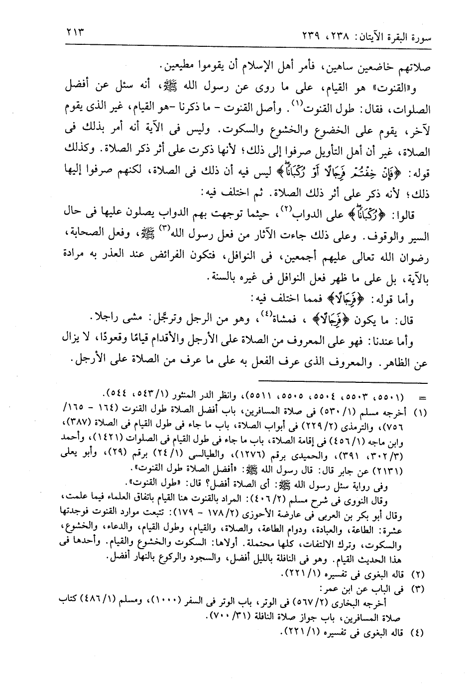 و" القنوت " هو القيام، على ما رُويَ عن رسول اللَّه - صَلَّى اللَّهُ عَلَيهِ وَسَلَّمَ -، أنه سئل عن أفضل الصلوات، فقال: طول القنوت. وأصل القنوت - ما ذكرنا - هو القيام، غير الذي يقوم لآخر، يفوم على الخضوع والخشوع والسكوت. وليس في الآية أنه أمر بذلك في الصلاة، غير أن أهل التأويل صرفوا إلى ذلك؛ لأنها ذكرت على أثر ذكر الصلاة. وكذلك قوله: (فَإِنْ خِفْتُمْ فَرِجَالًا أَوْ رُكْبَانًا (239) ليس فيه أن ذلك في الصلاة، لكنهم صرفوا إليها ذلك؛ لأنه ذكر على أثر ذلك الصلاة. ثم اختلف فيه: