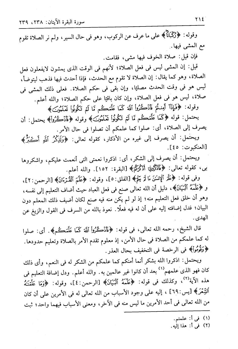 قال الشيخ، رحمه اللَّه تعالى، في قوله: (فَاذْكُرُوا اللَّهَ كَمَا عَلَّمَكُمْ). أي: صلوا له كما علمكم من الصلاة في حال الأمن، إذ معلوم تقدم الأمر بالصلاة وتعليم حدودها. (وَقُومُوا) في الرخصة في التخفيف بحال العذر.
