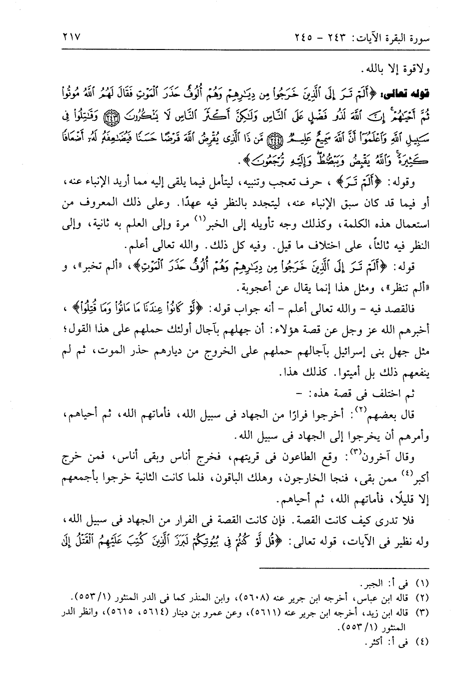 قوله تعالى: (أَلَمْ تَرَ إِلَى الَّذِينَ خَرَجُوا مِنْ دِيَارِهِمْ وَهُمْ أُلُوفٌ حَذَرَ الْمَوْتِ فَقَالَ لَهُمُ اللَّهُ مُوتُوا ثُمَّ أَحْيَاهُمْ إِنَّ اللَّهَ لَذُو فَضْلٍ عَلَى النَّاسِ وَلَكِنَّ أَكْثَرَ النَّاسِ لَا يَشْكُرُونَ (243) وَقَاتِلُوا فِي سَبِيلِ اللَّهِ وَاعْلَمُوا أَنَّ اللَّهَ سَمِيعٌ عَلِيمٌ (244) مَنْ ذَا الَّذِي يُقْرِضُ اللَّهَ قَرْضًا حَسَنًا فَيُضَاعِفَهُ لَهُ أَضْعَافًا كَثِيرَةً وَاللَّهُ يَقْبِضُ وَيَبْسُطُ وَإِلَيْهِ تُرْجَعُونَ (245).