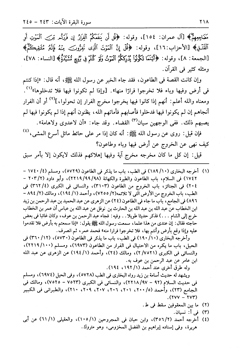 وإن كانت القصة في الطاعون، فقد جاء الخبر عن رسول اللَّه - صَلَّى اللَّهُ عَلَيهِ وَسَلَّمَ -، أنه قال: " إذا كنتم في أرض وفيها وباء فلا تخرجوا فرارًا منها ". " وإذا لم تكونوا فيها فلا تدخلوها ".
