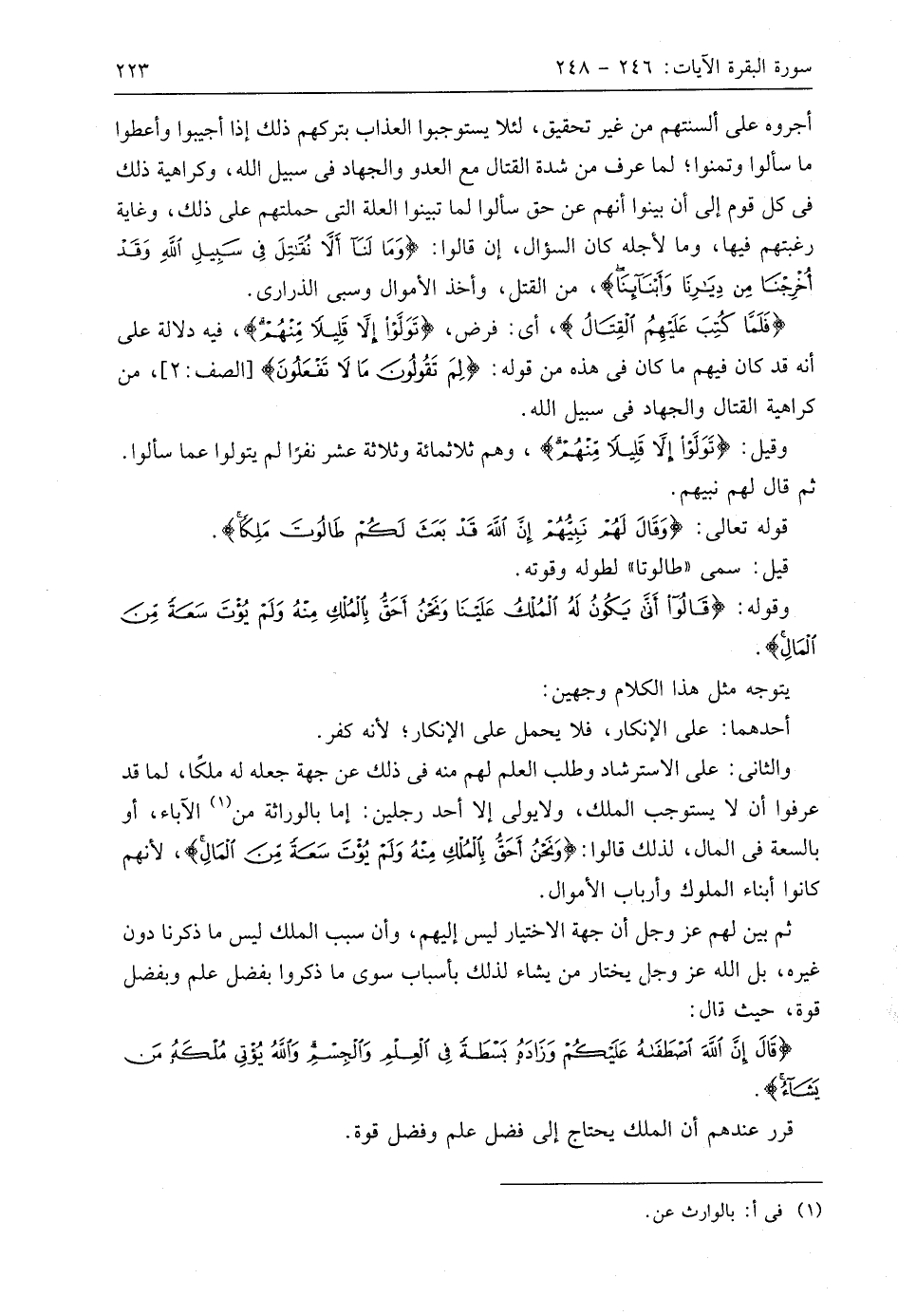 والثاني: على الاسترشاد وطلب العلم لهم منه في ذلك عن جهة جعله له ملكًا، لما قد عرفوا أن لا يستوجب الملك، ولا يولى إلا أحد رجلين: إما بالوراثة من الآباء، أو بالسعة في المال، لذلك قالوا: (وَنَحْنُ أَحَقُّ بِالْمُلْكِ مِنْهُ وَلَمْ يُؤْتَ سَعَةً مِنَ الْمَالِ)، لأنهم كانوا أبناء الملوك وأرباب الأموال.