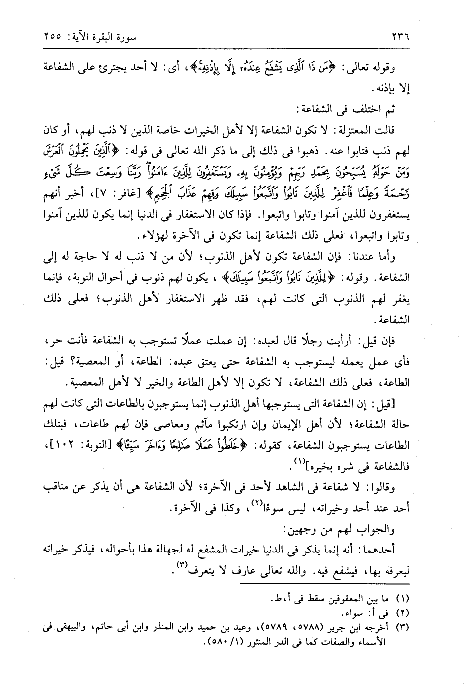 قالت المعتزلة: لا تكون الشفاعة إلا لأهل الخيرات خاصة الذين لا ذنب لهم، أو كان لهم ذنب فتابوا عنه. ذهبوا في ذلك إلى ما ذكر اللَّه تعالى في قوله: (الَّذِينَ يَحْمِلُونَ الْعَرْشَ وَمَنْ حَوْلَهُ يُسَبِّحُونَ بِحَمْدِ رَبِّهِمْ وَيُؤْمِنُونَ بِهِ وَيَسْتَغْفِرُونَ لِلَّذِينَ آمَنُوا رَبَّنَا وَسِعْتَ كُلَّ شَيْءٍ رَحْمَةً وَعِلْمًا فَاغْفِرْ لِلَّذِينَ تَابُوا وَاتَّبَعُوا سَبِيلَكَ وَقِهِمْ عَذَابَ الْجَحِيمِ)، أخبر أنهم يستغفرون للذين آمنوا وتابوا واتبعوا. فإذا كان الاستغفار في الدنيا إنما يكون للذين آمنوا وتابوا واتبعوا، فعلى ذلك الشفاعة إنما تكون في الآخرة لهَؤُلَاءِ.