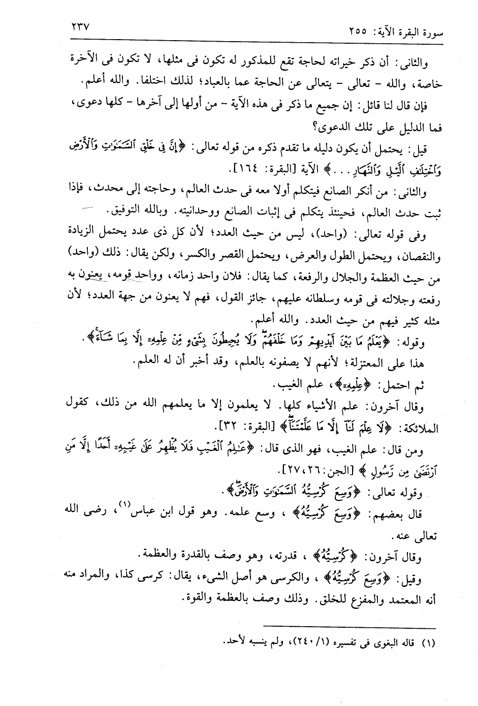 وقوله تعالى: (وَسِعَ كُرْسِيُّهُ السَّمَاوَاتِ وَالْأَرْضَ).