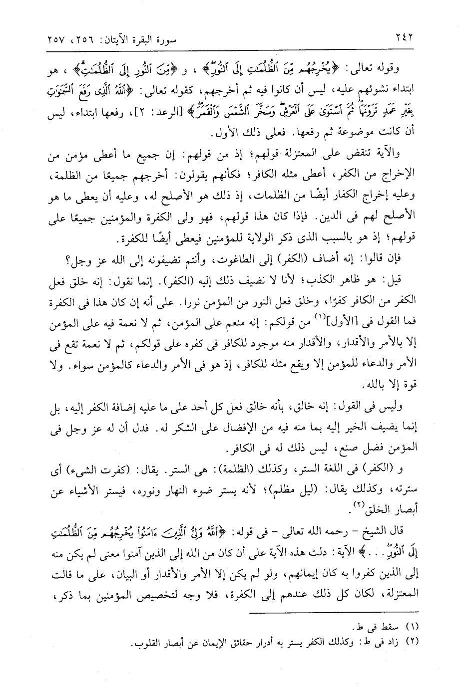 قال الشيخ - رحمه اللَّه تعالى - في قوله: (اللَّهُ وَلِيُّ الَّذِينَ آمَنُوا يُخْرِجُهُمْ مِنَ الظُّلُمَاتِ إِلَى النُّورِ. . .) الآية: دلت هذه الآية على أن كان من اللَّه إلى الذين آمنوا معنى لم يكن منه إلى الذين كفروا به كان إيمانهم، ولو لم يكن إلا الأمر والأقدار أو البيان، على ما قالت المعتزلة، لكان كل ذلك عندهم إلى الكفرة، فلا وجه لتخصيص المؤمنين بما ذكر،