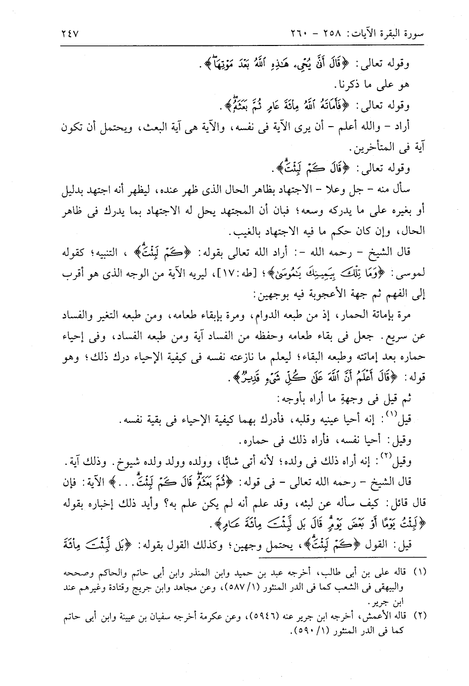 وقوله تعالى: (فَأَمَاتَهُ اللَّهُ مِائَةَ عَامٍ ثُمَّ بَعَثَهُ).