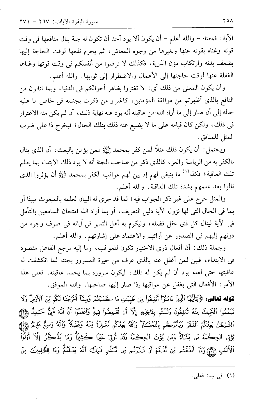 قوله تعالى: (يَا أَيُّهَا الَّذِينَ آمَنُوا أَنْفِقُوا مِنْ طَيِّبَاتِ مَا كَسَبْتُمْ وَمِمَّا أَخْرَجْنَا لَكُمْ مِنَ الْأَرْضِ وَلَا تَيَمَّمُوا الْخَبِيثَ مِنْهُ تُنْفِقُونَ وَلَسْتُمْ بِآخِذِيهِ إِلَّا أَنْ تُغْمِضُوا فِيهِ وَاعْلَمُوا أَنَّ اللَّهَ غَنِيٌّ حَمِيدٌ (267) الشَّيْطَانُ يَعِدُكُمُ الْفَقْرَ وَيَأْمُرُكُمْ بِالْفَحْشَاءِ وَاللَّهُ يَعِدُكُمْ مَغْفِرَةً مِنْهُ وَفَضْلًا وَاللَّهُ وَاسِعٌ عَلِيمٌ (268) يُؤْتِي الْحِكْمَةَ مَنْ يَشَاءُ وَمَنْ يُؤْتَ الْحِكْمَةَ فَقَدْ أُوتِيَ خَيْرًا كَثِيرًا وَمَا يَذَّكَّرُ إِلَّا أُولُو الْأَلْبَابِ (269) وَمَا أَنْفَقْتُمْ مِنْ نَفَقَةٍ أَوْ نَذَرْتُمْ مِنْ نَذْرٍ فَإِنَّ اللَّهَ يَعْلَمُهُ وَمَا لِلظَّالِمِينَ مِنْ