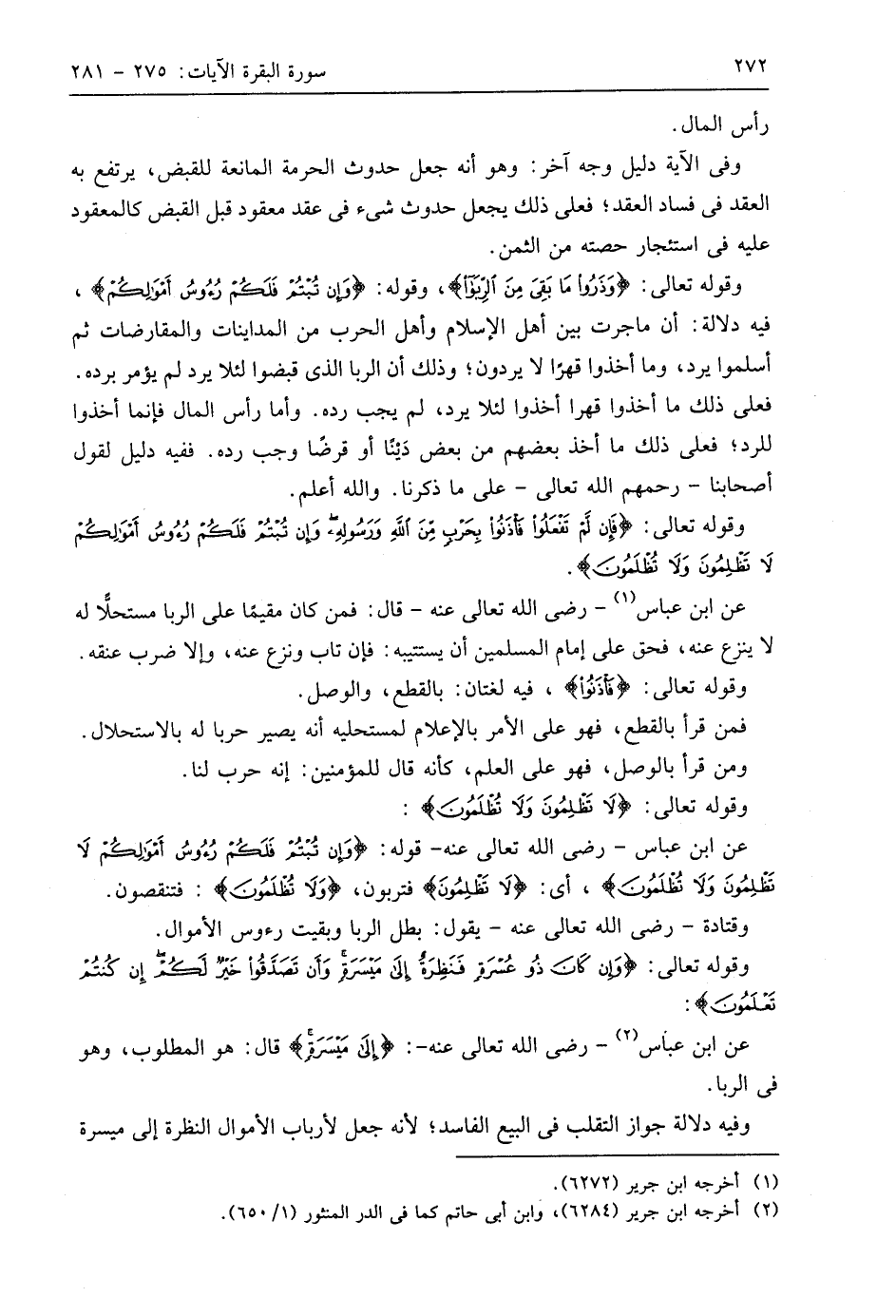 عن ابن عَبَّاسٍ - رضي اللَّه تعالى عنه - قوله: (وَإِنْ تُبْتُمْ فَلَكُمْ رُءُوسُ أَمْوَالِكُمْ لَا تَظْلِمُونَ وَلَا تُظْلَمُونَ)، أي: (لَا تَظْلِمُونَ) فتربون، (وَلَا تُظْلَمُونَ): فتنقصون.