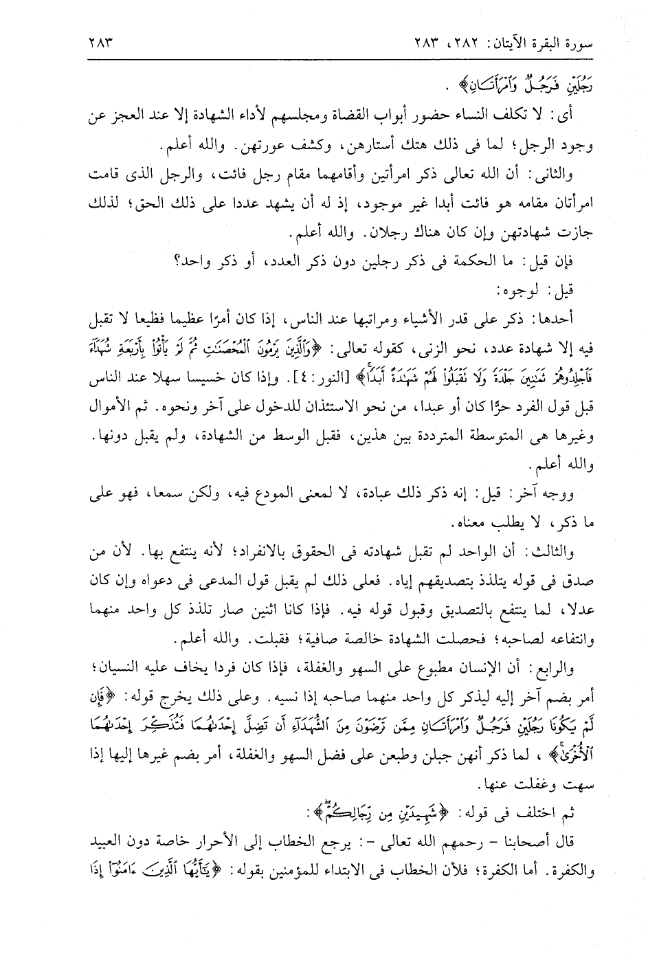 والرابع: أن الإنسان مطبوع على السهو والغفلة، فإذا كان فردا يخاف عليه النسيان؛ أمر بضم آخر إليه ليذكر كل واحد منهما صاحبه إذا نسيه. وعلى ذلك يخرِج قوله: (فَإِنْ لَمْ يَكُونَا رَجُلَيْنِ فَرَجُلٌ وَامْرَأَتَانِ مِمَّنْ تَرْضَوْنَ مِنَ الشُّهَدَاءِ أَنْ تَضِلَّ إِحْدَاهُمَا فَتُذَكِّرَ إِحْدَاهُمَا الْأُخْرَى)، لما ذكر أنهن جبلن وطبعن على فضل السهو والغفلة، أمر بضم غيرها إليها إذا سهت وغفلت عنها.