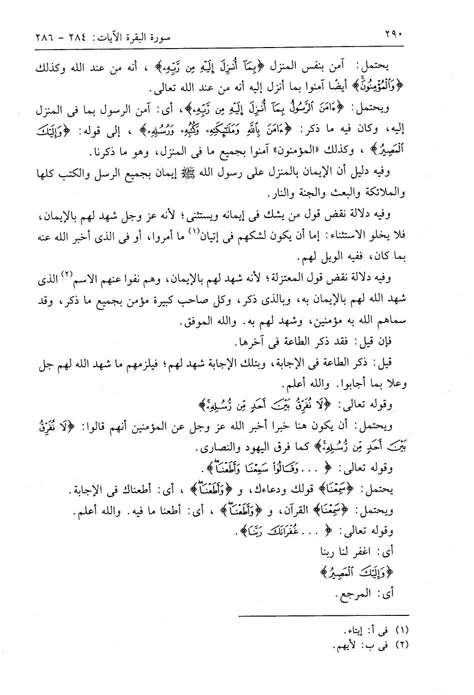ويحتمل: (آمَنَ الرَّسُولُ بِمَا أُنْزِلَ إِلَيْهِ مِنْ رَبِّهِ)، أي: آمن الرسول بما في المنزل إليه، وكان فيه ما ذكر: (آمَنَ بِاللَّهِ وَمَلَائِكَتِهِ وَكُتُبِهِ وَرُسُلِهِ)، إلى قوله: (وَإِلَيْكَ الْمَصِيرُ)، وكذلك " المؤمنون " آمنوا بجميع ما في المنزل، وهو ما ذكرنا.